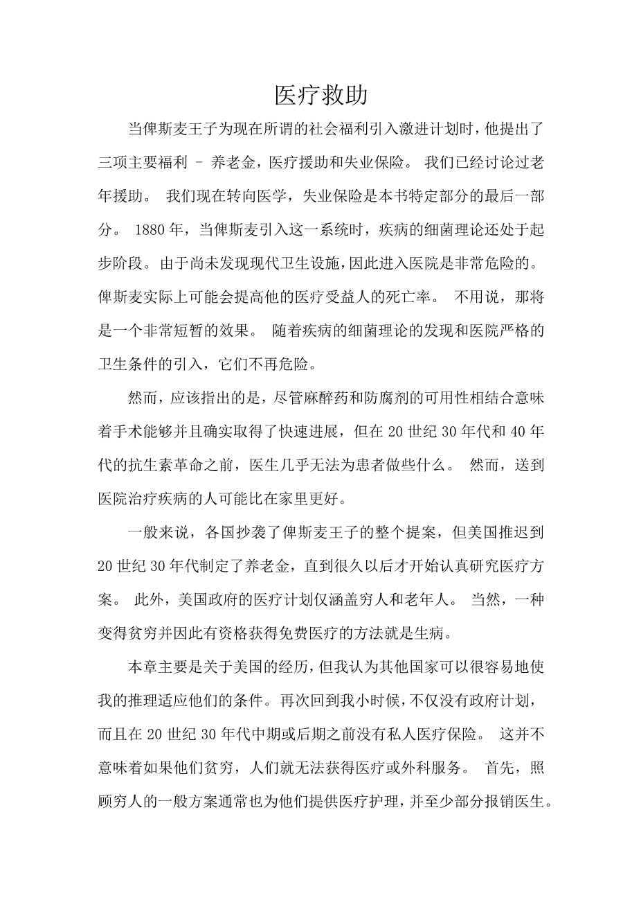 In general, various countries copied Prince Bismarck#39;s entire proposal, but the United States delayed enacting the old-age pensions until the 1930s and did not get seriously to work on medical programs until much later. Further, American government medical programs cover only poor and elderly people. Of course, one way of becoming poor and thus eligible for free medical attention is to become ill.