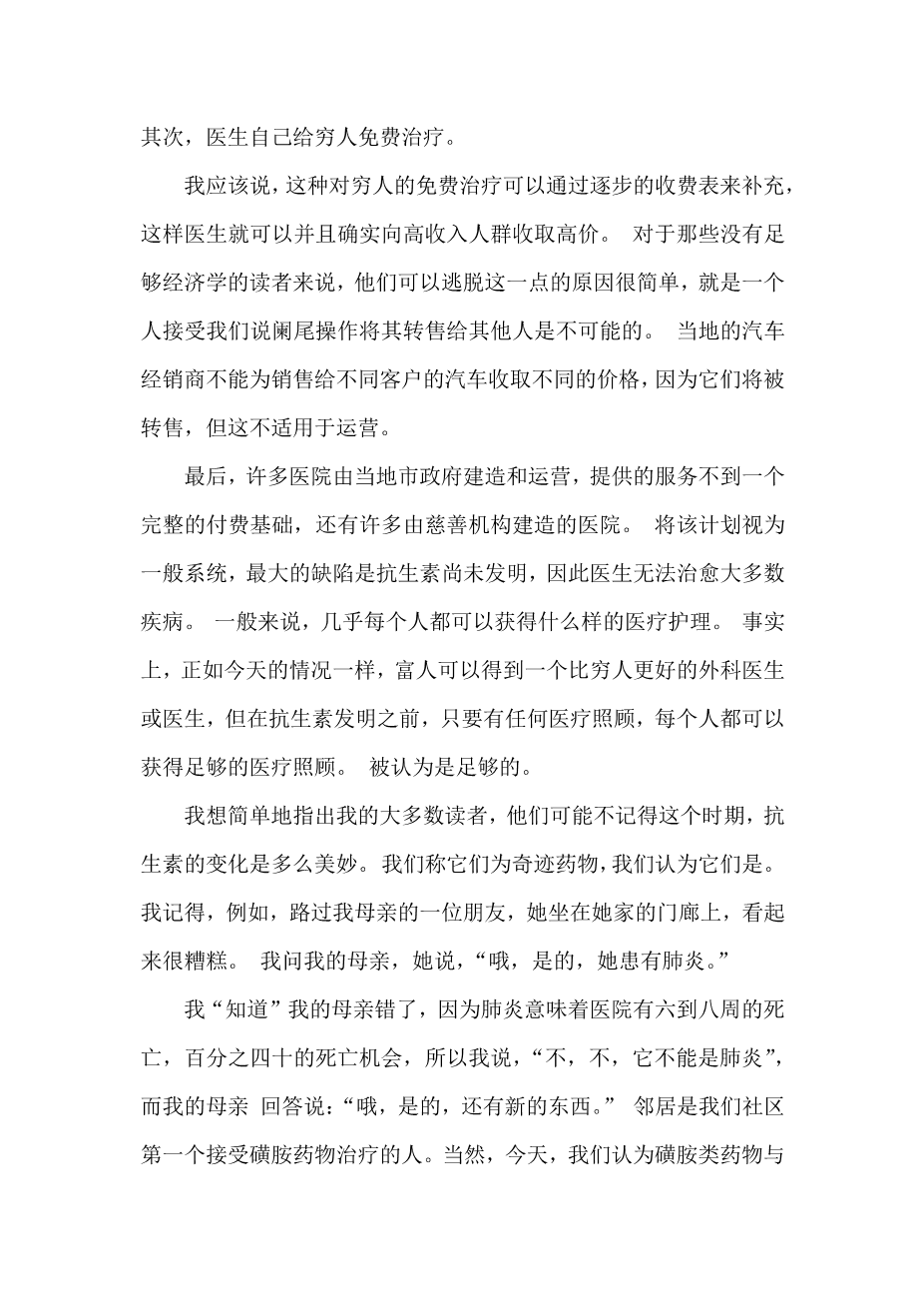 Finally, a great many hospitals were built and operated by local city governments and provided services on less than a full fee-paying basis, and a great many hospitals which were built by charitable institutions. Looking at the program as a general system, the great defect was that antibiotics had not yet been invented and hence doctors could not actually cure most diseases. What medical attention was available was, in general, available to almost everyone. It was true, as it is true today, that a wealthy person could get a better surgeon, or doctor, than could a poor person, but more or less everybody could get adequate medical attention insofar as any medical attention before the invention of antibiotics could be regarded as adequate.