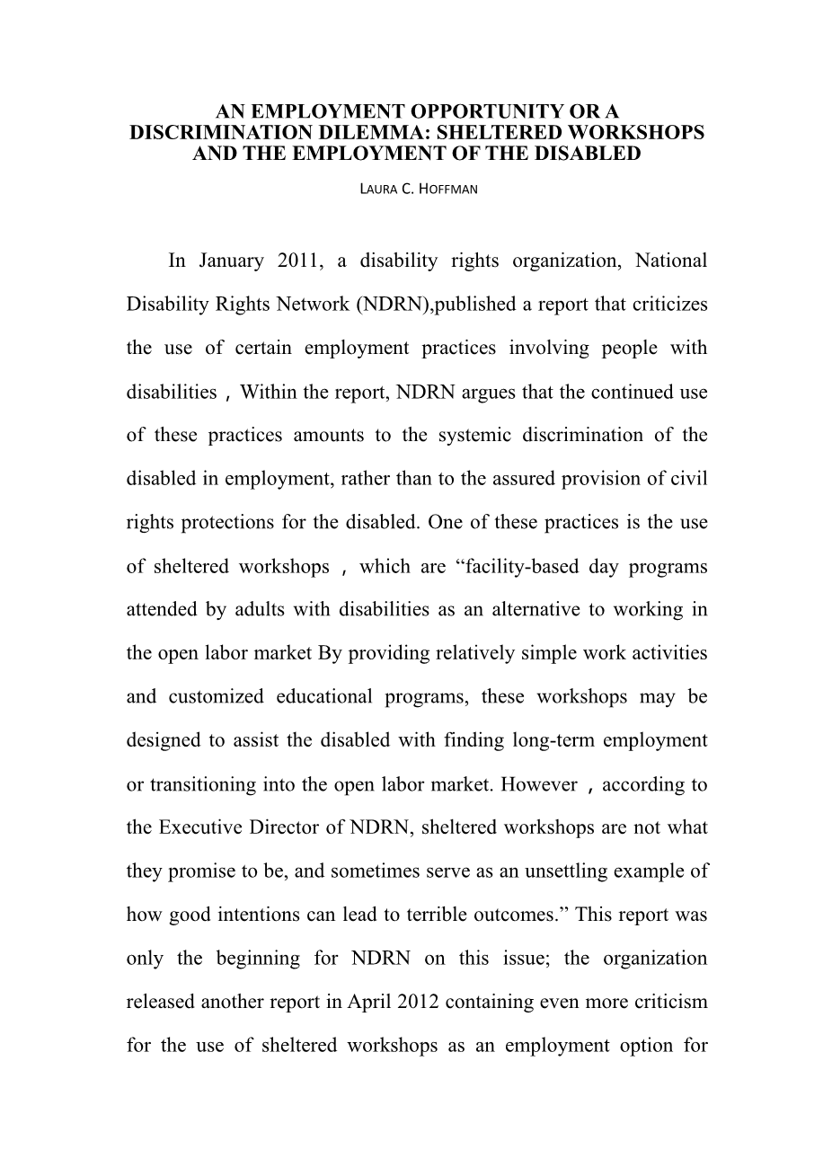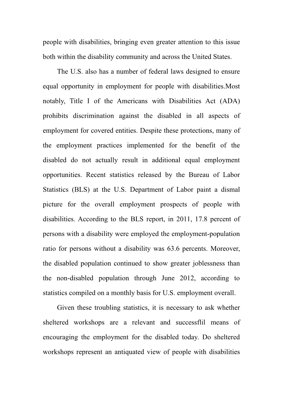 美国还制定了一系列旨在确保残疾人就业机会平等的联邦法律。最值得注意的是,“美国残疾人法案”(ADA)第一部分禁止在受保护实体就业的各个方面歧视残疾人。尽管有这些保护措施,为残疾人福利实施的许多就业做法实际上并没有带来额外的平等就业机会。劳工统计局(BLS)最近在美国劳工部发布的统计数据描绘了残疾人整体就业前景的惨淡景象。根据BLS报告,2011年,17.8%的残疾人就业......无残疾人的就业人口比例为63.6%。此外,根据美国就业总体月度编制的统计数据,截至2012年6月,残疾人口的失业率仍然高于非残疾人口。