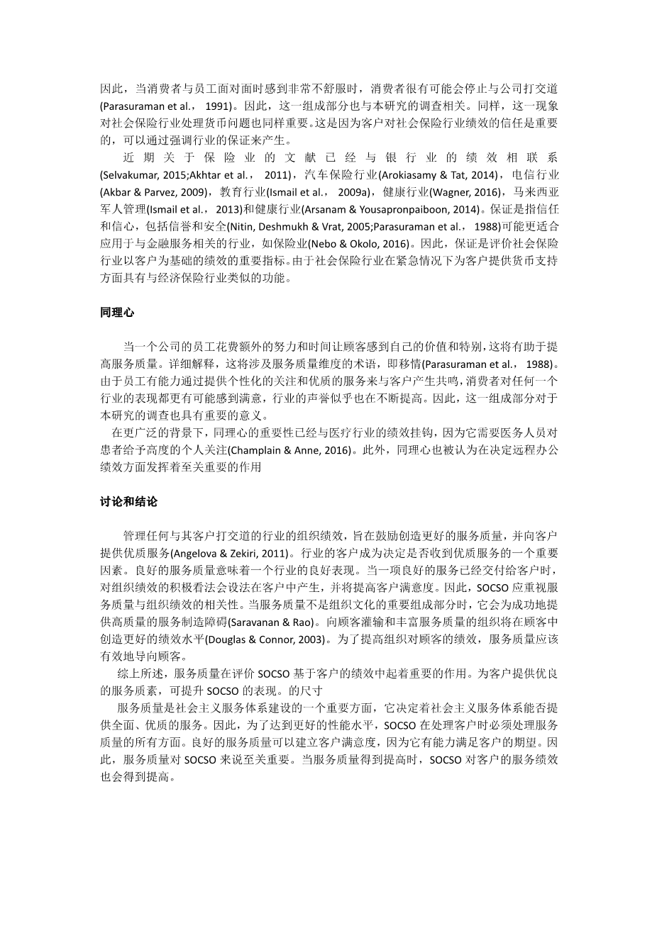 In local context, service quality found to be an important determinant to evaluate the performance of an organization that deliver financial services to its customers (Arokiasamy amp; Tat, 2014; Akbar amp; Parvez, 2009). Even though the nature of the relationship was significant, little was known about the role of service quality as an important predicting factor in the literature of organizational performance (Osman amp; Sentosa, 2013; Raza et al., 2012). Scant of studies have been done to link the role of service quality on evaluating customer-based performance of SOCSO. Therefore, this study looking at this niche segment which was not previously studied from Malaysian perspective (Ismail, Ahmad, Rose, Abdullah, Rahman amp; Francis, 2013). Thus, it motivated the researchers to further explore the link between service quality and customer-based performance of SOCSO.