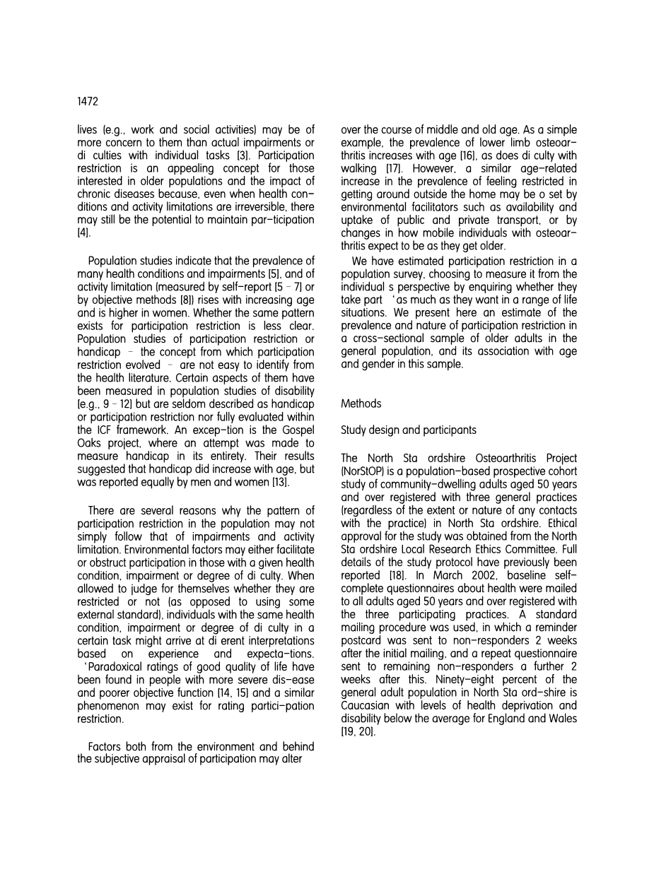 人口研究表明,许多健康状况和损伤[5]以及活动受限(通过自我报告[5-7]或通过客观方法[8]测量)的患病率随着年龄的增长而增加,并且在女性中更高。是否存在参与限制的相同模式尚不清楚。参与限制或障碍的人口研究 - 参与限制演变的概念 - 不容易从健康文献中识别出来。它们的某些方面已经在残疾人群研究中进行了测量[例如,9-12],但很少被描述为障碍或参与限制,也未在ICF框架内进行全面评估。一个例外是福音奥克斯项目,其中试图完全衡量残疾。他们的结果表明,残疾确实随着年龄的增长而增加,但男性和女性同样报告[13]。