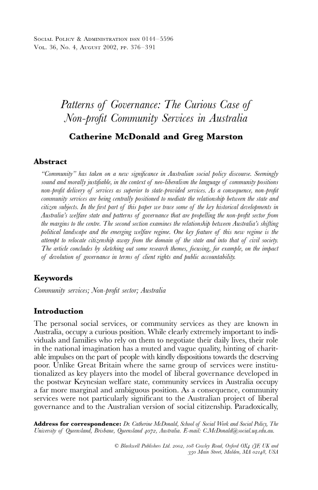 “社区”在澳大利亚社会政策中具有新的意义。在新自由主义的语境下,社区语言上看起来很健全且道德上合理,它使非营利性服务的提供优于国家服务的提供,因此,非营利性社区服务部门正在集中调解国家和公民主体之间的关系。在本文的第一部分,我们追溯了澳大利亚福利国家的一些关键历史发展以及推动非营利部门从边缘向中心推进的治理模式。第二部分考察了澳大利亚政治格局转变与新兴福利制度之间的关系。这个新政权的一个关键特征是企图将公民权利从国家领域转移到公民社会领域。本文最后部分概述了一些研究主题,重点讨论了治理在客户权利和公共责任方面权力下放的影响。