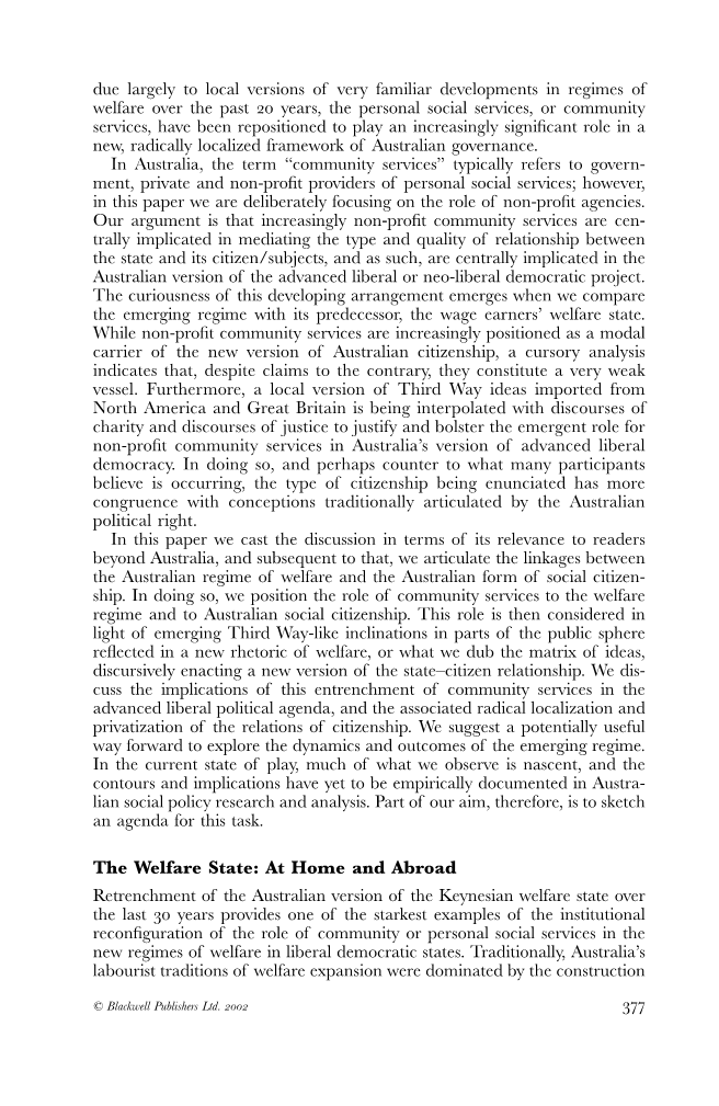 在本文中,我们根据与澳大利亚以外的读者的相关性展开讨论,然后阐明澳大利亚福利制度与澳大利亚社会公民形式之间的联系。在这样做的过程中,我们将社区服务的角色定位于福利制度和澳大利亚社会公民身份。然后,考虑到在公共领域出现的第三种类似倾向,这种角色反映在福利的新修辞中,我们称之为思想矩阵,在话语上制定新版本的国家公民关系。我们讨论了在先进的自由主义政治议程中加强社区服务的影响,以及公民关系的激进本地化和私有化。我们建议一种潜在有用的方式来探索新兴政权的动态和结果。在目前的情况下,我们所观察到的大部分内容都是新生的,而澳大利亚的社会政策研究和分析还没有以实证的方式记录轮廓和影响。因此,我们的部分目标是为这项任务勾画一个议程。