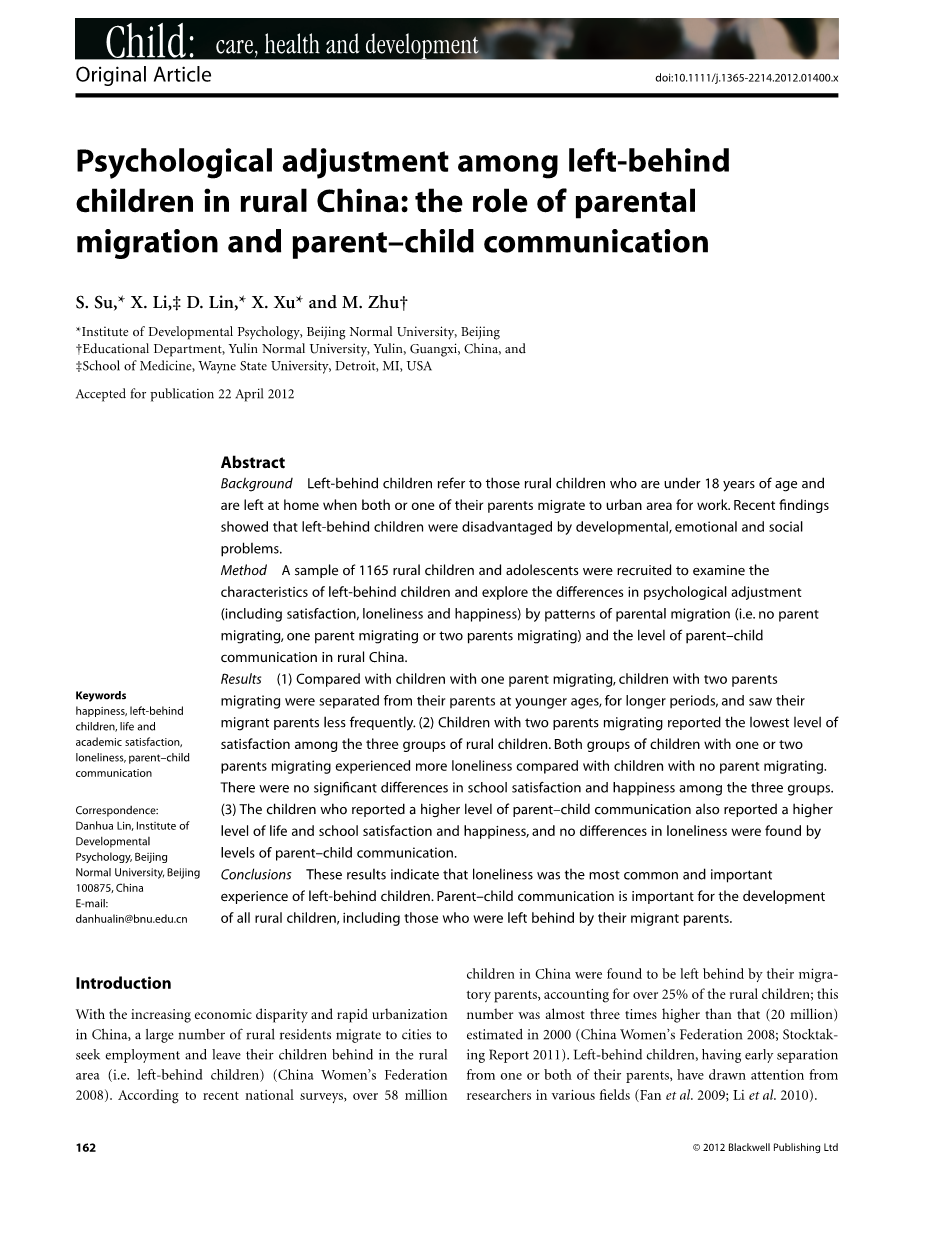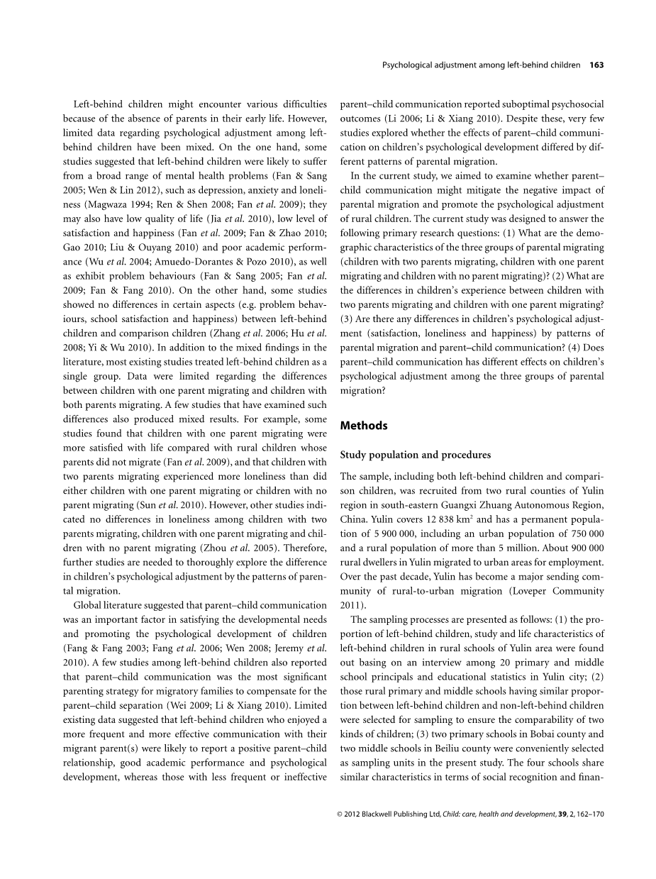 通过对1165例农村儿童和青少年进行抽样调查, 研究留守儿童的特点, 并通过父母模式探讨心理调节 (包括满意度、孤独感和幸福感) 的差异。迁移 (即没有父母迁移, 一个父母迁移或两个父母迁移) 和 亲子沟通的水平在中国农村。