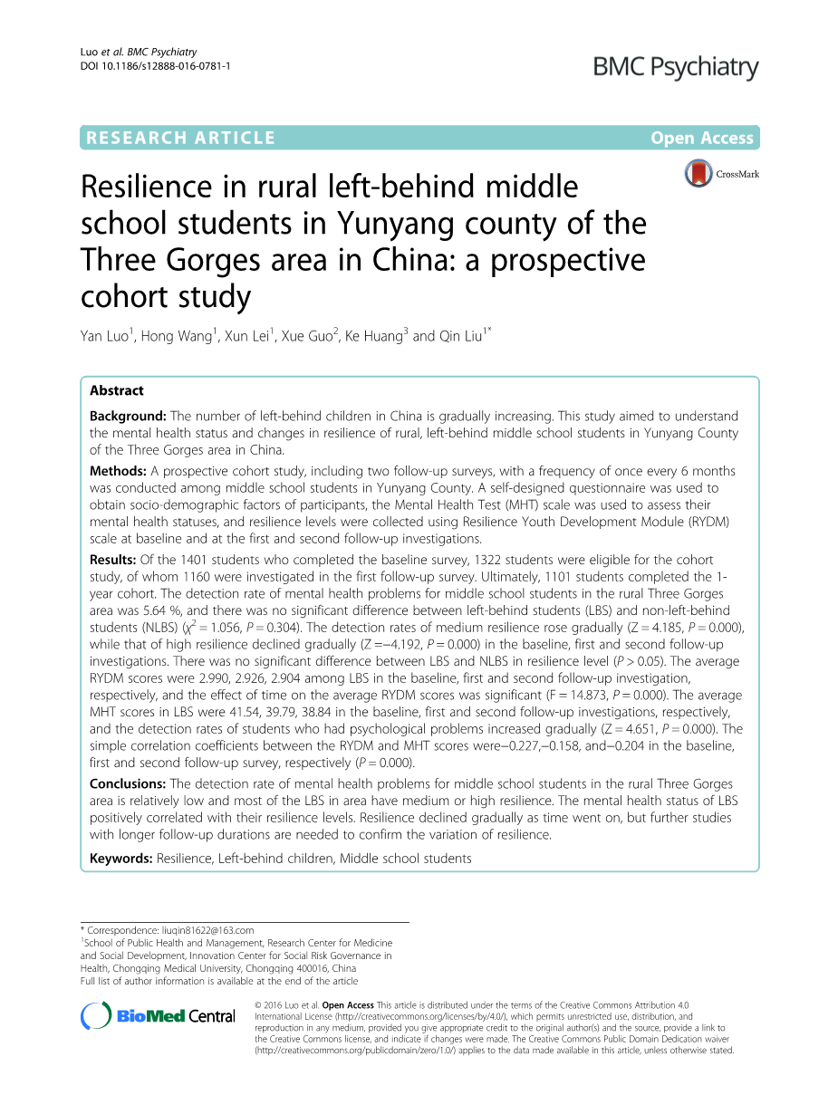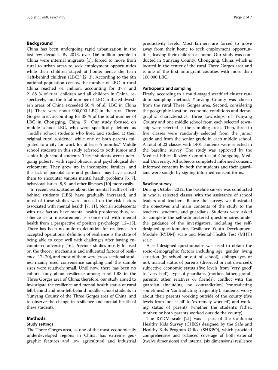 中国已经在过去的几十年里经历了快速的城市化。2013,在中国1亿6600万人的国内移民[1],被迫离开农村到城市寻找就业机会,而他们的孩子呆在家里;因此,留守儿童“(LBC)”[2、3]。根据第六次全国人口普查,LBC在农村中国的人数达到6100万,37.7和21.88%的农村儿童和所有的孩子都在中国,分别核算,并在中国的中西部地区的留守儿童数量超过总数的50%。农村地区有三三峡地区约90万的留守儿童,中国重庆留守儿童占总数的38%[4]。我们的研究主要集中在中学LBC,他们被具体定义为“在原来的农村居住和学习的中学生,而其中一个或两个父母迁移到城市工作至少6个月。”本研究中学生指初中生和高中生。这些学生正处于青春期,身体和心理的快速发展。他们成长在不完整的家庭,缺乏父母的照顾和指导可能导致他们遇到各种心理健康问题(6, 7),行为问题([8, 9])和其他疾病(10)更容易。近年来,关于留守学生心理健康的研究逐渐增多,这些研究大多集中于与心理健康相关的危险因素(7, 11)。并不是所有有风险因素的青少年都有心理健康问题,因此,从积极心理学的角度来看,弹性作为衡量与心理健康有关[12—15]。他们成长在不完整的家庭,缺乏父母的照顾和指导可能导致他们遇到各种心理健康问题[6, 7],行为问题(8, 9)和其他疾病(10)更容易。目前还没有统一的弹性定义。一个公认的弹性定义是在遭遇逆境后能够很好地应对挑战的状态[16]。以往的研究主要集中在心理弹性理论、机制和影响因素[17—20],大多是横断面研究,主要采用便利抽样,样本量相对较小。直到现在,已经在中国三个三峡库区农村磅之间没有队列研究的能力;因此,本研究旨在调查农村留守与非留守在三三峡地区云阳县中学学生的心理健康状况的恢复对中国,并观察这些学生的心理弹性与心理健康的变化。