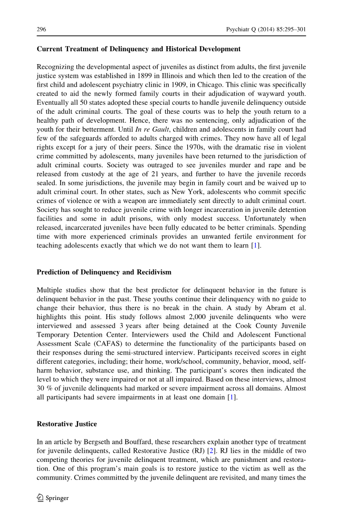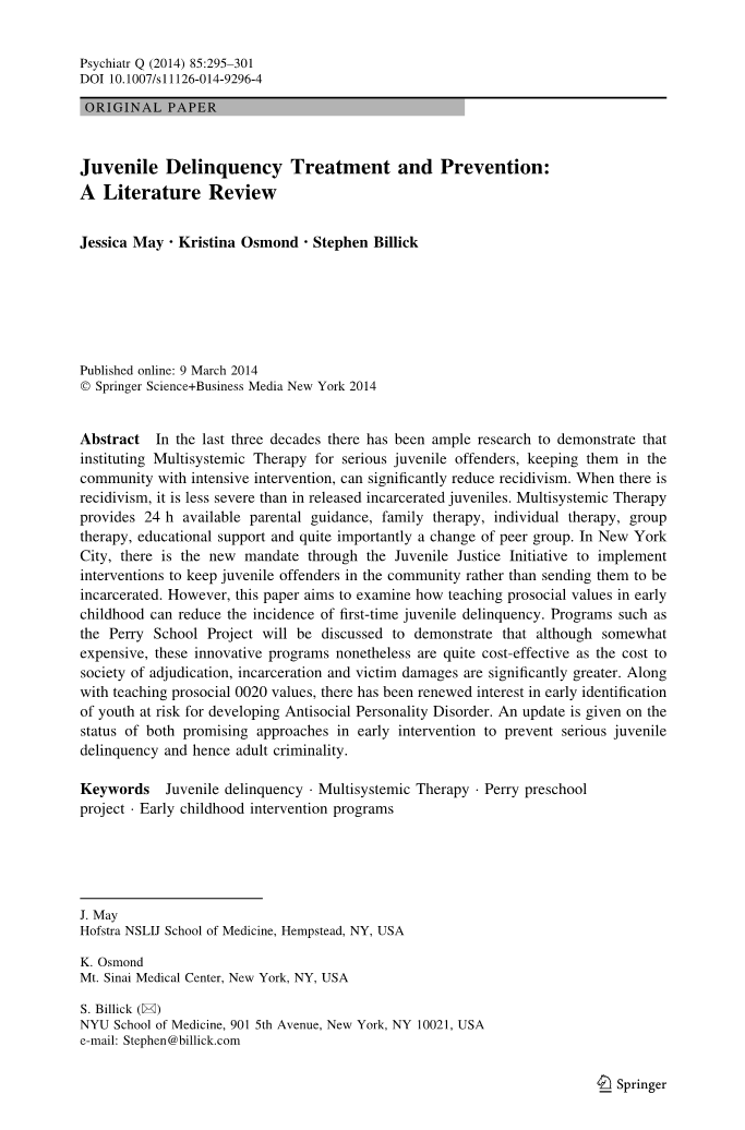对文献的回顾表明,过去有许多治疗青少年犯罪的方法。然而,很明显,只有少数人成功地减少了再犯,并为社会带来了积极的变化。MST已经成为一种以高成本有效的方式治疗少年犯的研究记录的黄金标准。MST成功地减少了累犯和累犯的严重程度。然而,社会的最终目标应该是防止青少年的全面参与。研究,如Perry的学前教育计划表明早期的资助计划对减少未来的犯罪行为产生积极的影响,并且对社会来说是非常具有成本效益的。通过将早期教育项目与支持项目相结合,佩里学前教育项目能够针对未来的违法行为,针对多种风险因素,包括反社会行为。因此,佩里学前教育项目是改革社会对青少年的最具潜力的投资,对青少年犯罪行为的危害最大。