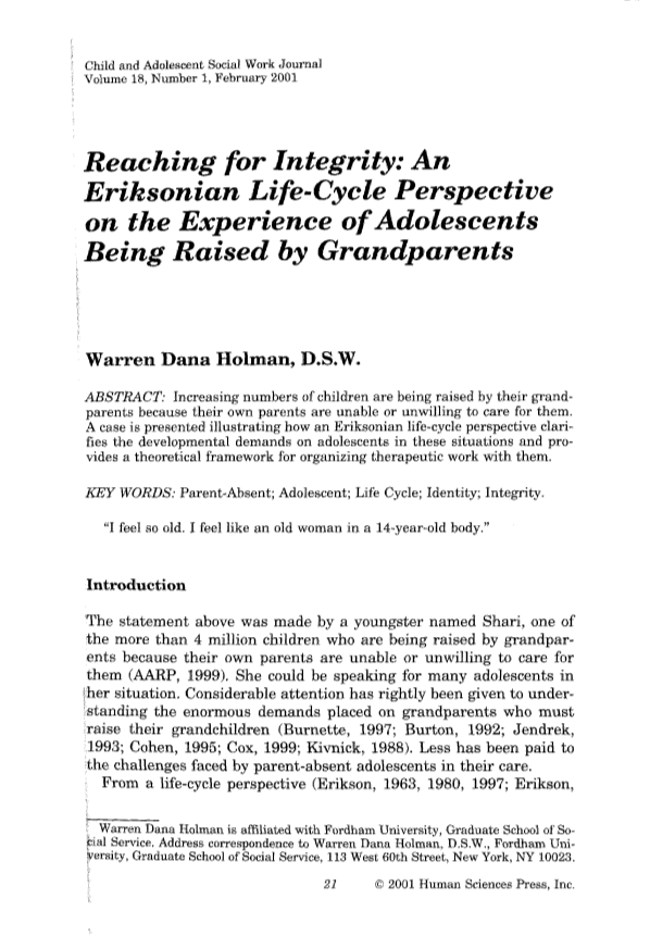 达到诚信:从埃里克森的生命周期观点看由祖父母抚养的青少年的经历