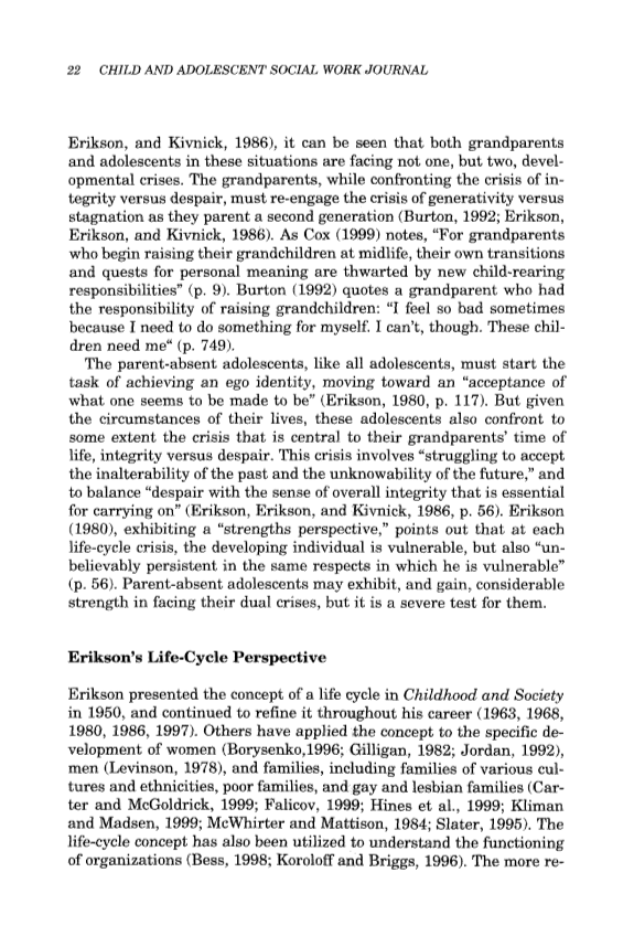 这篇论文关注的年轻人在青春期没有一个安全的父母基础。当他们蹒跚学步时,他们可能还没有经历过第一次信任与不信任的生命周期危机。祖父母可能为父母不在的孩子提供这个安全的基础;但监护权的祖父母不能同时扮演两个角色。当他们必须是他们的孙辈的父母时,他们就不能再在传统的照顾孙子孙女(Komhaber和Woodward, 1981年)之外的独特的养育、庇护和外部角色上了。因此,在这些监护情况下的青少年是双重剥夺的。失去双亲后,他们失去了祖父母的祖父母。