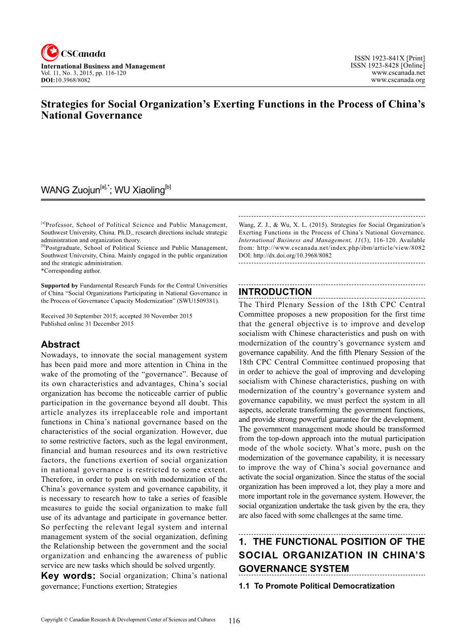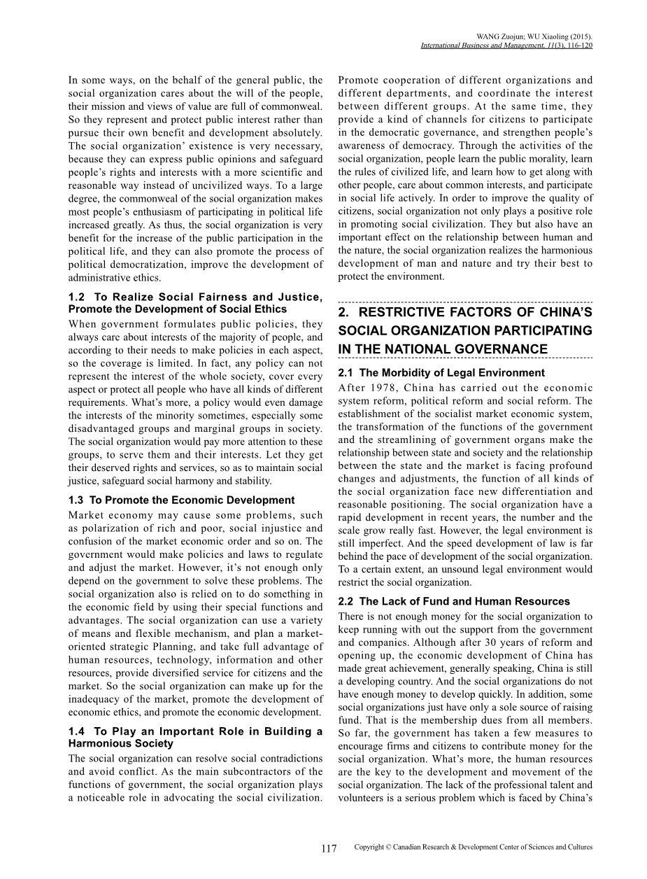 摘要:如今,随着管理工作的深入发展,创新社会管理体系在中国已经受到越来越多的关注。凭借自身的特点和优势,中国的社会组织毫无疑问的已经成为公众参与社会治理的显着载体。这篇文章基于社会组织的特点分析了其在中国国家治理过程中不可替代的角色和十分重要的功能。但是,由于一些限制性因素,如法律环境,经济状况和人力资源及其自身的限制性因素,社会组织在国家治理方面的功能发挥受到了一定的限制。因此,为了推动中国治理体系和治理能力的现代化,有必要研究如何采取一系列可行的方法措施引导社会组织充分发挥利用其优势以更好地参与治理。基于此,完善相关法律制度和社会组织的内部管理体系,界定政府与社会组织之间的关系和提高公众的服务意识是亟待解决的新课题。
