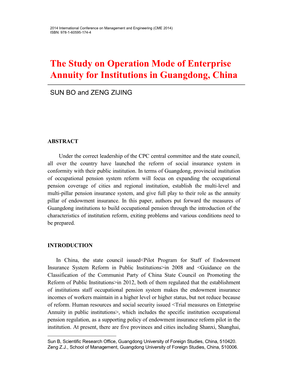 摘要:在中共中央和国务院的正确领导下,全国各地都开展了与事业单位相适应的社会保障制度改革。就广东省而言,省级事业单位企业年金制度改革的重点是扩大城市和地区的企业年金覆盖面,建立多层次、多支柱的养老保险制度,充分发挥年金作为养老保险支柱的作用。本文介绍了事业单位改革的特点、存在的问题和各种需要准备的条件,并在此基础上提出了广东省事业单位建立企业年金制度的措施。