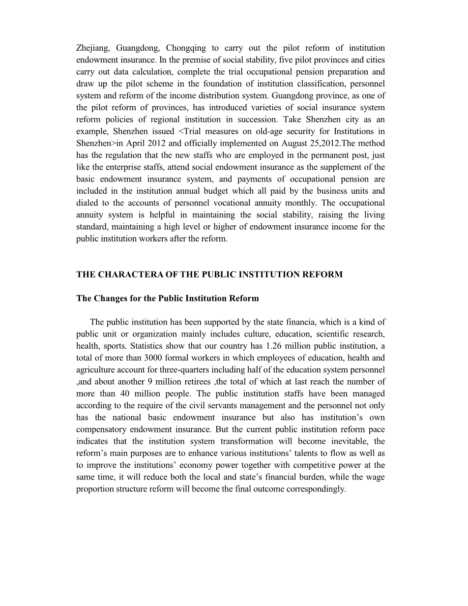 2008年,国务院颁布了《事业单位工作人员养老保险制度改革试点方案》;2012年,国务院发布了《中共中央国务院关于分类推进事业单位改革的指导意见》。这两份政府文件都规定了事业单位工作人员职业年金制度的建立应该使工作人员养老保险收入不至于因为改革而降低,从而维持在一个较高的水平或者更高的状况。人力资源和社会保障部颁布了《事业单位职业年金试行办法》。该文件作为事业单位养老保险改革试点的配套政策,提出了具体的事业单位职业年金条例。现如今,山西、上海、浙江、广东、重庆5省市展开了事业单位养老保险改革试点工作。在确保社会稳定的前提下,5个试点省市在事业单位分类、人事制度和收入分配制度改革的基础上进行数据测算论证,完成试行职业年金的准备工作,并制定试点方案。广东省作为改革的试点省市之一,连续引进了多种地区性事业单位的社会保障制度改革政策。以深圳市为例,2012年4月深圳市颁布了《深圳市事业单位工作人员养老保障试行办法》,并于2012年8月25日正式实施该试行办法。《深圳市事业单位工作人员养老保障试行办法》规定,受聘于常设岗位的新员工应当与企业职工一样参加社会养老保险,将其当作是基本养老保险制度的补充;职业年金缴费列入事业单位的年度预算,由单位全额缴交,并按月划拨至参加人员的职业年金账户中。职业年金制度有助于维护社会稳定,提高人民的生活水平,使事业单位职工退休后的养老保险收入不至于因为改革而降低,从而维持在一个较高水平或者更高的状况。