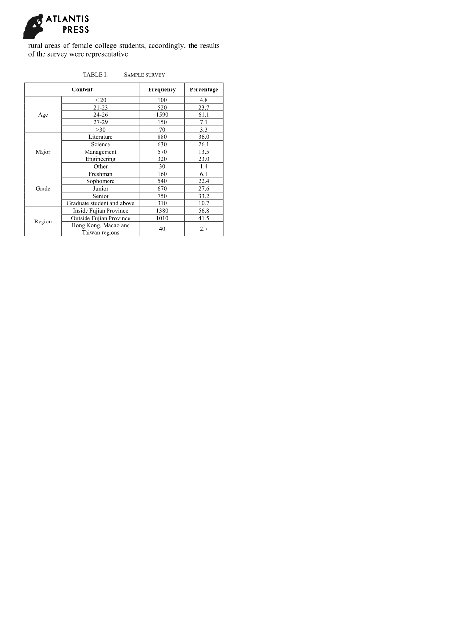 笔者在华侨大学,福建大学,厦门大学,福建师范大学,三明大学,莆田大学,闽江大学,福建医科大学,浙江大学商学院,浙江工业大学,浙江大学,南昌大学进行了问卷调查。以及2016年3月5日东南地区12所典型大学女生,共发放问卷3000份,回收2520份,有效问卷2430份(表1)。其有效率达到81%,我们通过网络QQ聊天,实地考察和个人访谈调查的人数为200.研究对象主要涉及艺术,科学,工程,管理等各类科目。而成绩分配涉及大一新生到医生。我们调查了福建省,江西省,浙江省,香港,澳门和台湾地区,包括城市和大学生以及教育对策。最后,它收获丰硕。[1] - [9]女大学生担当社会群体妇女的骨干。他们觉醒的女大学生农村地区,因此调查结果具有代表性。
