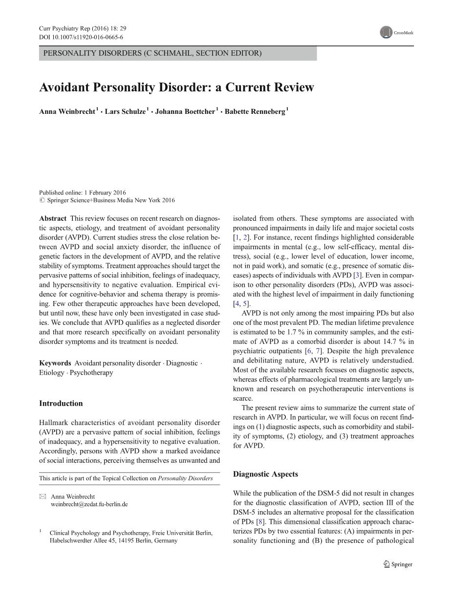 本综述主要集中在近期有关回避型人格障碍(AVPD)的诊断、病因学和治疗方面的研究。目前的研究强调AVPD与社交焦虑障碍之间的密切关系,遗传因素在AVPD发展中的影响以及症状的相对稳定性。治疗方法应针对普遍存在的社会抑制模式,不足感和对反面评价的超敏反应。经验证据表明认知行为疗法和图式治疗是有效的。一些其他疗法也已经开发出来,但是至今为止,仅在个案研究中得到探讨。我们得出这样的结论:AVPD被认为是一种被忽视的疾病,需要更多关于回避型人格障碍症状及其治疗的研究。