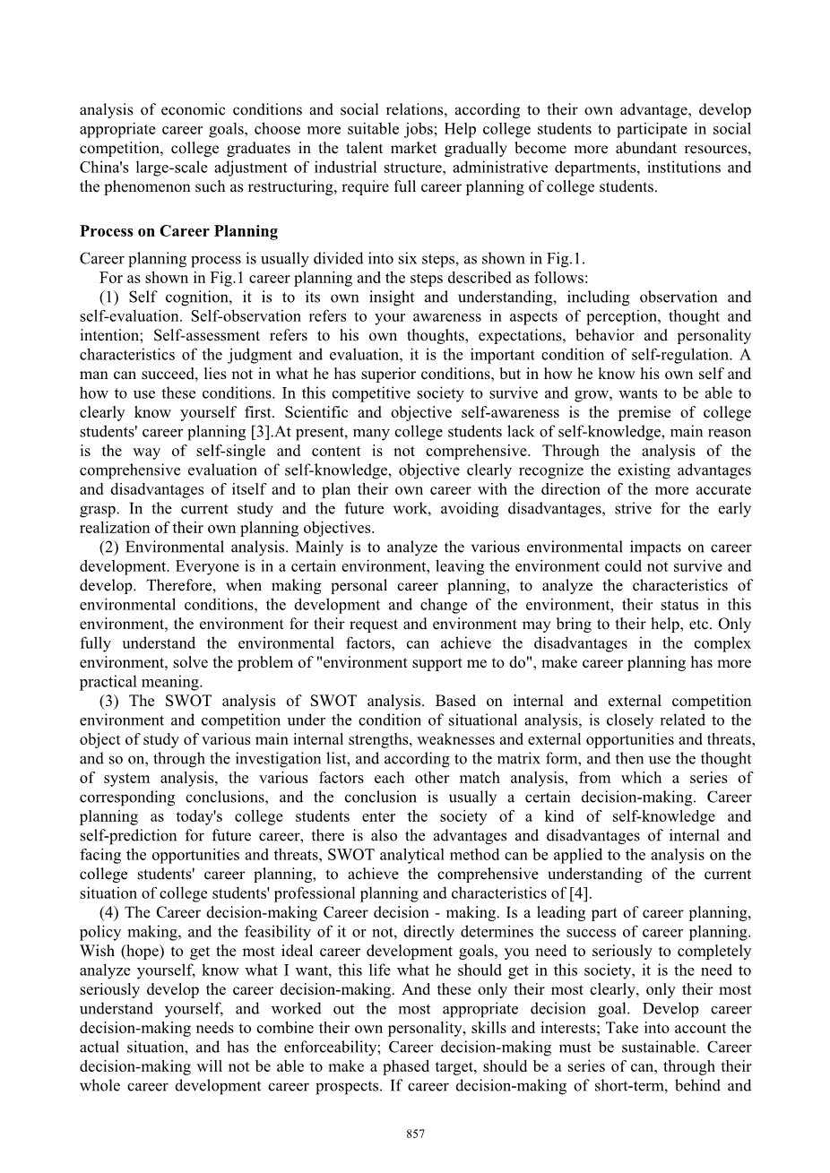摘要:进行大学生职业规划,大学生可以充分认识自己和客观分析环境,在规划最佳职业目标和路径的基础上,提升学生的核心竞争力,提供全面发展。本文根据自我认知、环境分析、SWOT分析、职业决策、目标分解、评估和调整过程构建职业规划流程图,并对各步骤进行简要说明;设计职业生涯规划书,为学生的职业生涯规划提供参考。职业规划是一项系统工程,实际的职业规划,要充分发挥政府、学校、家庭和学生的作用,实现职业发展。