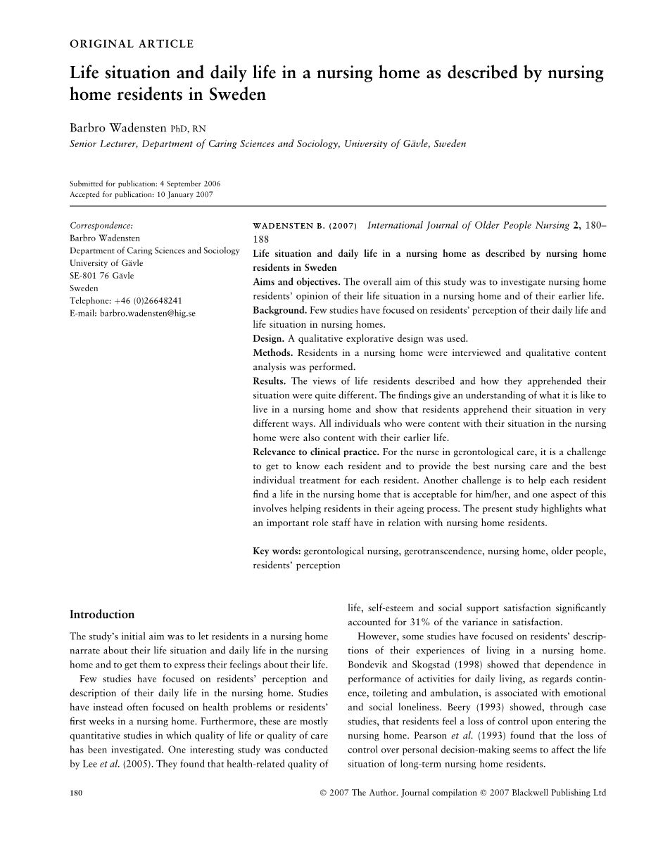 Mattiasson和Andersson(1997)研究了养老院居民对养老院护理质量的看法。他们发现,对膳食和个人援助的关怀质量高度满意,居民感到安全。另一方面,在对社会关系的看法中发现了巨大的差异。跑步(1994)表明,虽然居民生活在相似的条件下,但他们对养老院生活的体验却是独一无二的。一些研究表明,被动接受和充分利用情况是在护理院中处理生活的最常见方法(Kahn,1990;Porter&Clinton,1992;Iwasiw等人,1996)。在他们的评论中,Lee等人(2002)得出结论认为,需要更多研究居民对养老院的调整和生活经历,因为大多数研究都是在安置时进行的。