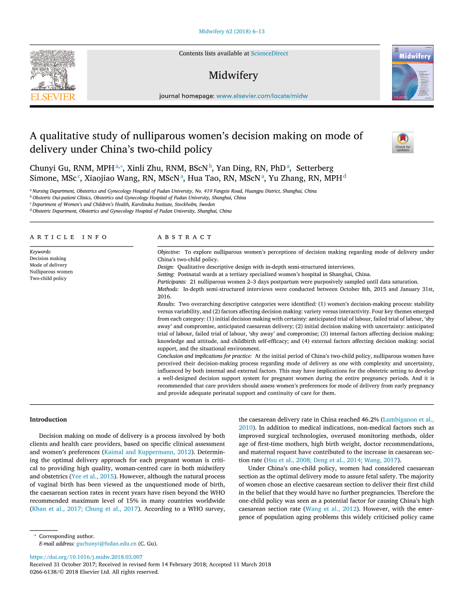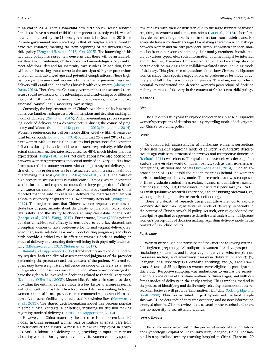 由于需要评估和时间限制的妇女人数众多,与产科医生在一起的时间不多(gu等人,2013年)。因此,他们通常不会从产科获得有关ffi的信息。 医生们。没有为妇女和护理提供者之间的共同决策安排适当的时间。虽然妇女可以从其他来源,包括她们的家庭寻求信息。 会员、朋友、各类媒体等,这些信息可能是非正式的,具有误导性。因此,我国孕妇对生育决策缺乏足够的支持。 与此相关的问题,包括交付方式。这就引发了一个问题,即中国无生育妇女如何塑造她们对脱衣舞娘模式的fic期望或偏好? 割礼-制作过程。因此,我们认为有必要理解和描述妇女在中国两胎政策背景下对分娩方式的决策的看法。