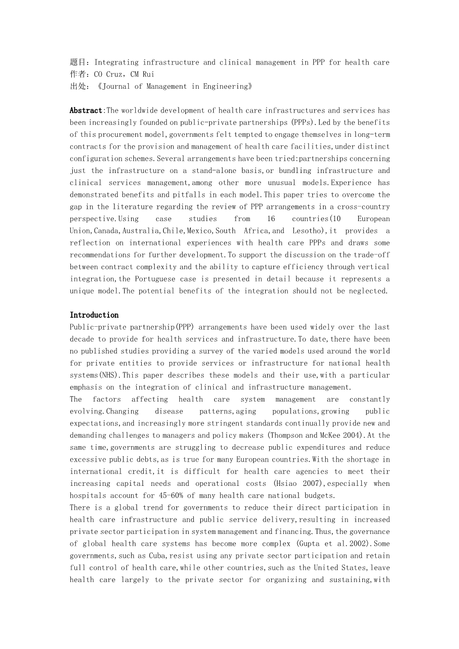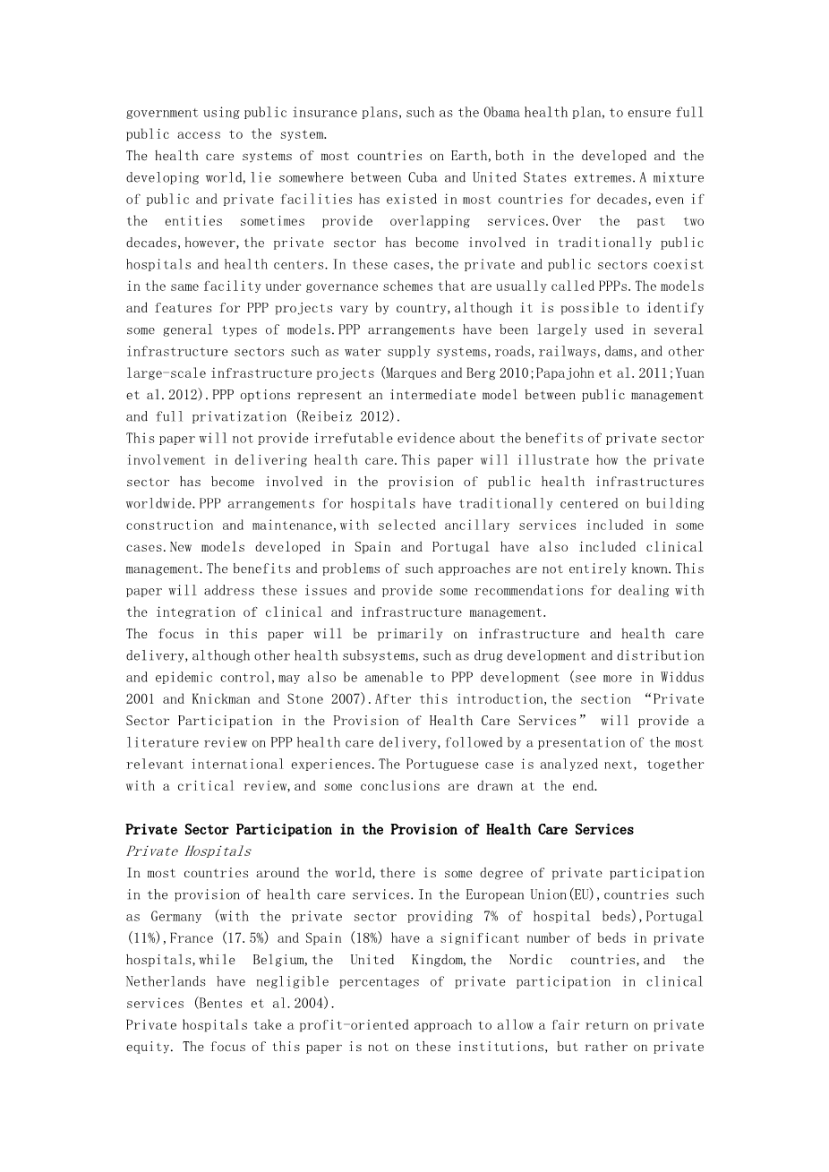 本文的重点将主要集中在基础设施和卫生保健的交付上,尽管其他卫生子系统,如药物开发和分发和控制疫情,也可能有利于PPP的发展(见Widdus 2001 and Knickman and Stone 2007)。在此介绍之后,“私营部门参与提供卫生保健服务”一节将提供一份关于PPP保健服务的文献综述,然后介绍最相关的国际经验。接下来将分析葡萄牙的案例,并对其进行批判性回顾,最后得出一些结论。