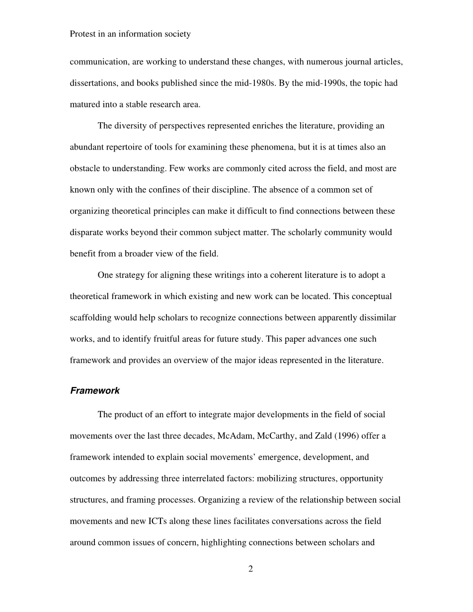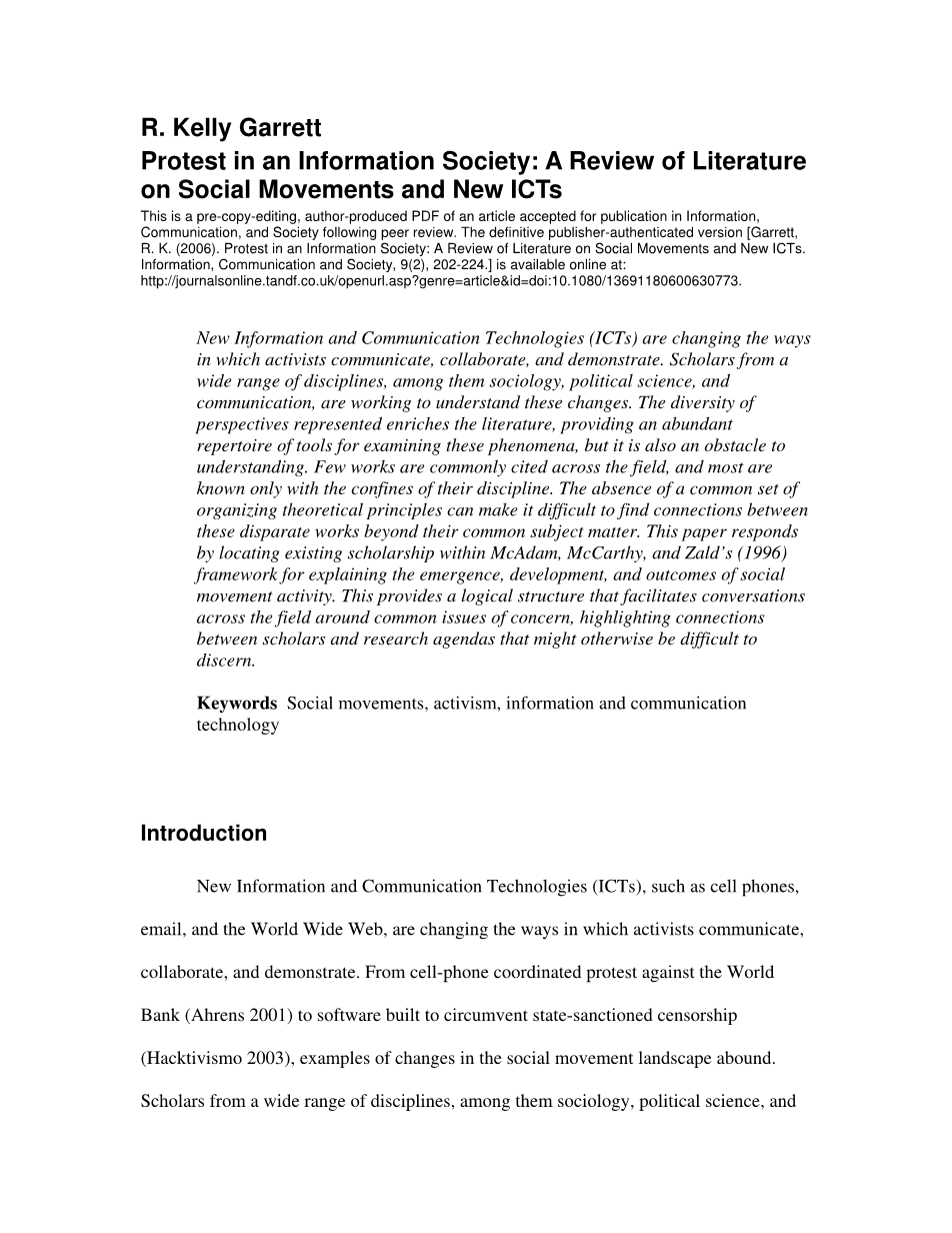 信息社会中的对抗:关于社会运动和新信息通信技术的综述外文翻译资料