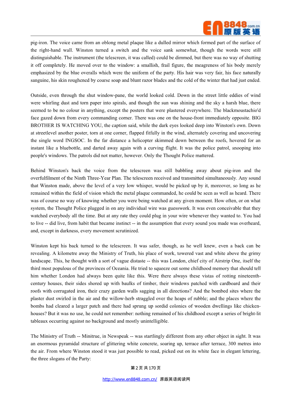 外面,即使通过关上的玻璃窗,看上去也是寒冷的。在下面街心里,阵阵的小卷风把尘土和碎纸吹卷起来,虽然阳光灿烂,天空蔚蓝,可是除了到处贴着的招贴画以外,似乎什么东西都没有颜色。那张留着黑胡子的脸从每一个关键地方向下凝视。在对面那所房子的正面就有一幅,文字说朋是:老大哥在看着你。那双黑色的眼睛目不转睛地看着温斯顿的眼睛。在下面街上有另外一张招贴画,一角给撕破了,在风中不时地吹拍着,一会儿盖上,一会儿又露出唯一的一个词 “英社”。在远处,一架直升飞机在屋预上面掠过,像一只蓝色的瓶子似的徘徊了一会,又绕个弯飞走。这是警察巡逻队,在伺察人们的窗户。不过巡逻队并不可怕,只有思想警察才可怕。
