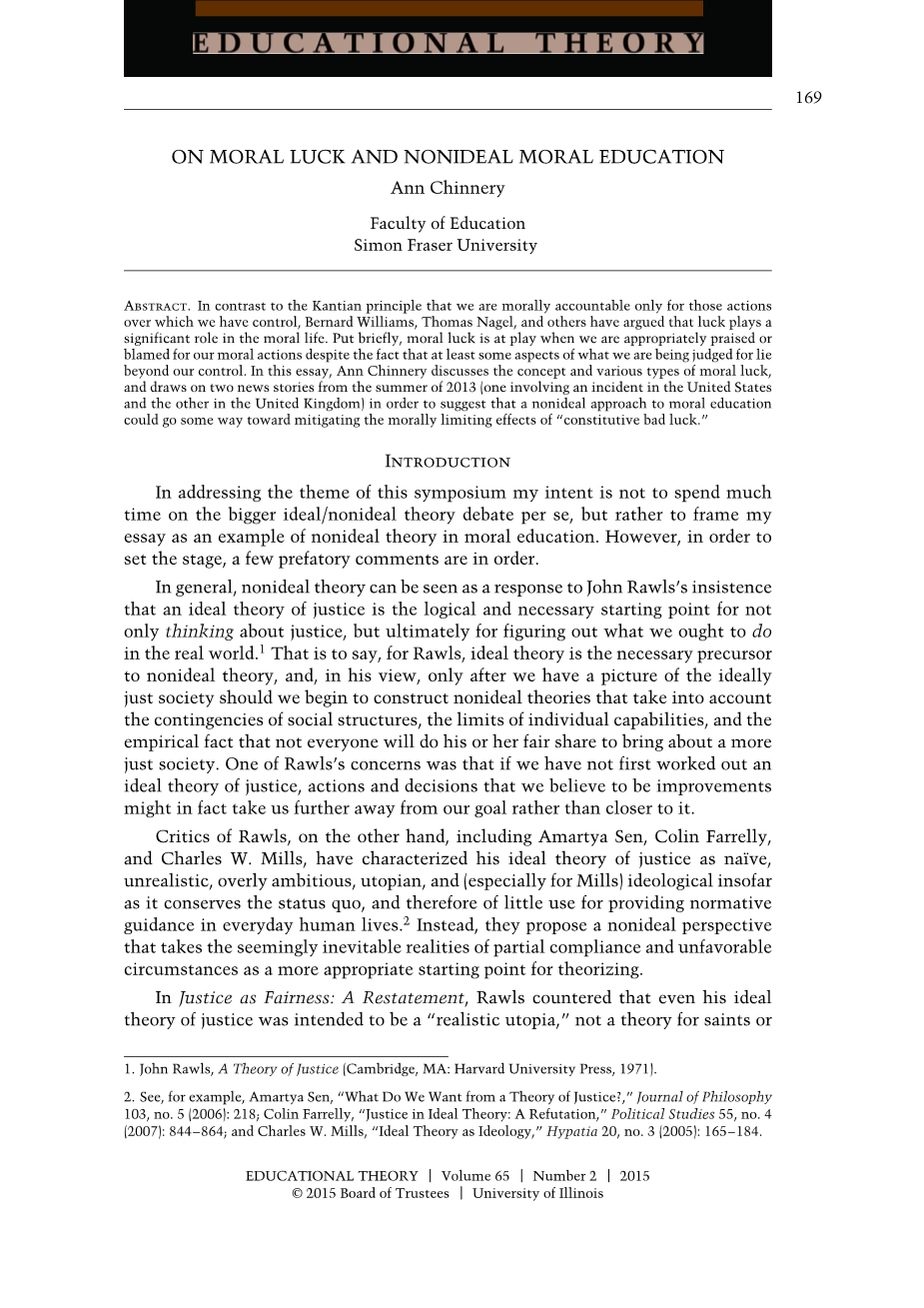 道德上的幸运有好有坏——也就是说,一个人既可以是“道德上的幸运”,也可以是“道德上的不幸”[12]——下面我将详细介绍它的种类和特征。然而,这篇文章的主要观点是,道德哲学家和教育家们长期以来忽视了教育在减轻道德上的限制作用,尤其是“天生的坏运气”。