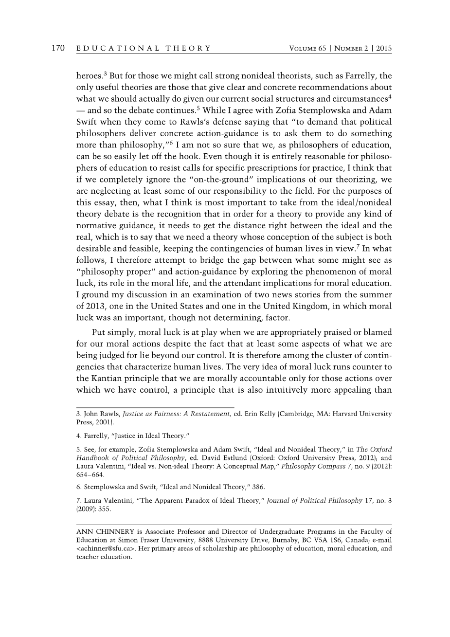 在《正义即公平:重述》一书中,罗尔斯反驳说,即使他的理想正义理论也意在成为一个“现实的乌托邦”,但不是圣人或英雄的理论。[3]但是,对于那些我们可以称之为强有力的非理想理论家的人,如法雷利,唯一有用的理论是那些就我们当前的社会结构和环境[4]实际应该做些什么提出明确和具体建议的理论。因此,争论还在继续。[5]我同意Zofia Stemplowska和亚当对迅速来到罗尔斯的辩护说“要求政治哲学家提供具体的行动指南要求他们做一些超过哲学”[6]我不太确定,我们作为哲学家的教育,可以轻易摆脱困境。尽管哲学教育工作者完全有理由拒绝为实践开出具体的处方,但我认为,如果我们完全忽视我们理论的“实际”含义,我们就至少忽略了我们对该领域的部分责任。对于这篇文章的目的,我认为最重要的是要从理想的或不理想的理论争论是为了让一个理论的识别提供任何形式的规范性指导,它需要理想和现实之间的距离,也就是说,我们需要一个理论概念的主题是可取的和可行的,让人类生活视角的突发事件。[7]因此,在接下来的文章中,我试图通过探索道德运气的现象、它在道德生活中的作用以及随之而来的道德教育的含义,来弥合一些人们可能认为的“哲学正确”与行动指导之间的差距。我对2013年夏天的两则新闻报道进行了分析,其中一则发生在美国,另一则发生在英国。在这两则新闻报道中,道德运气虽然不是决定性因素,但却是一个重要因素。