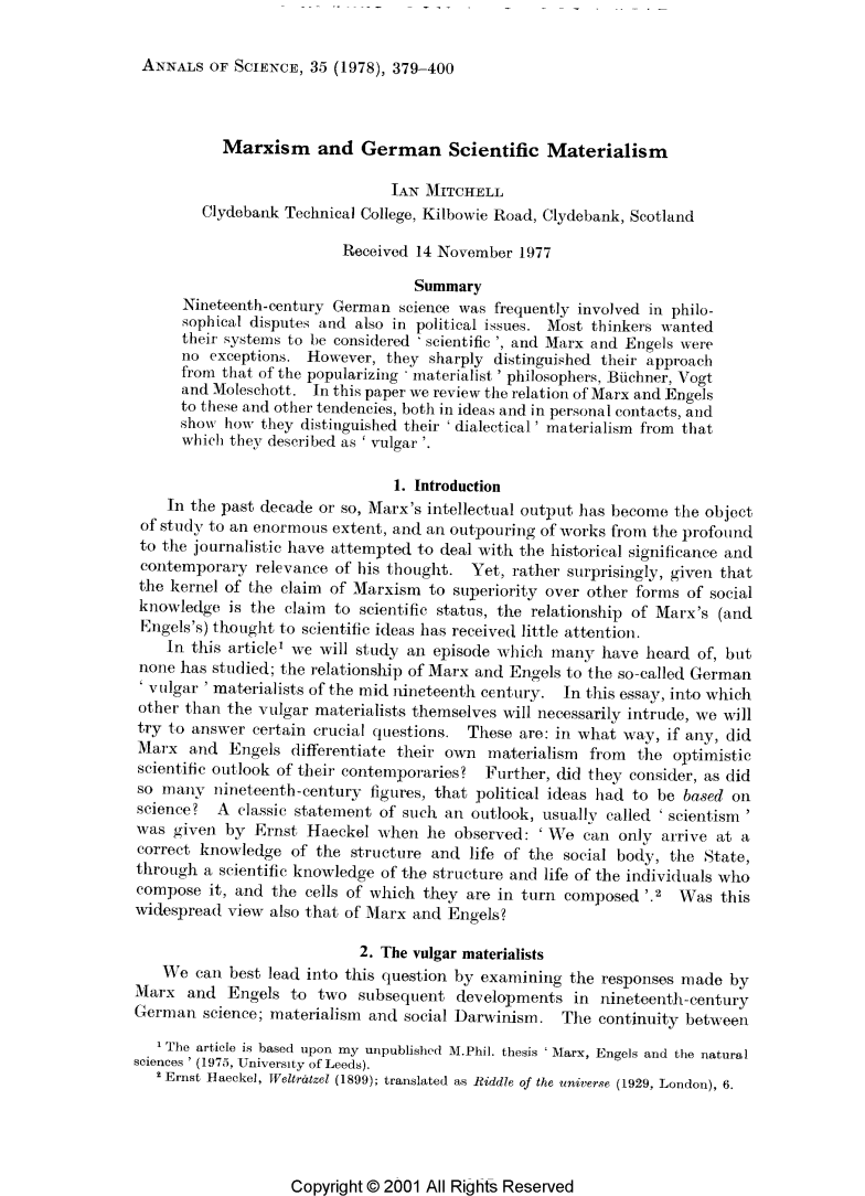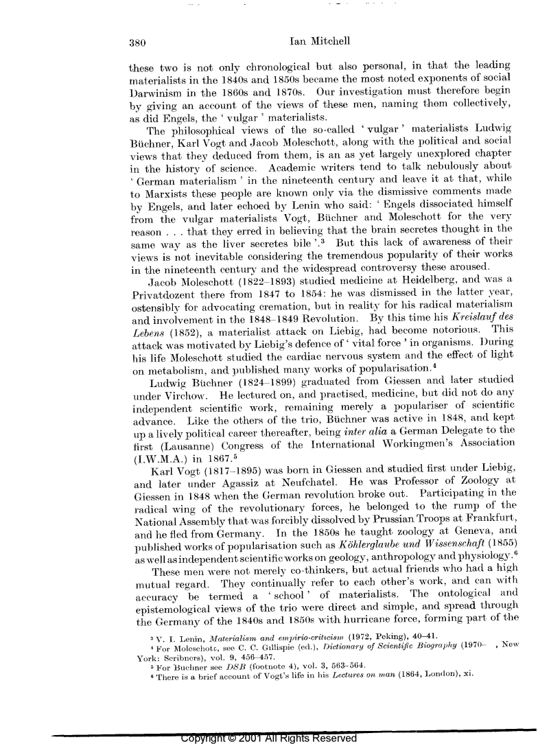 我们可以通过考察马克思和恩格斯对19世纪德国科学的两个后续发展的回答来引出这个问题。唯物主义和社会达尔文主义。这两者之间的延续性不仅是时间上的,也是人与人的,在19世纪40年代和19世纪50年代,主要的唯物主义者在19世纪60年代和70年代成为社会达尔文主义的最著名的倡导者。因此,我们的调查必须首先说明这些人的观点,并把他们统称为“庸俗的”唯物主义者。