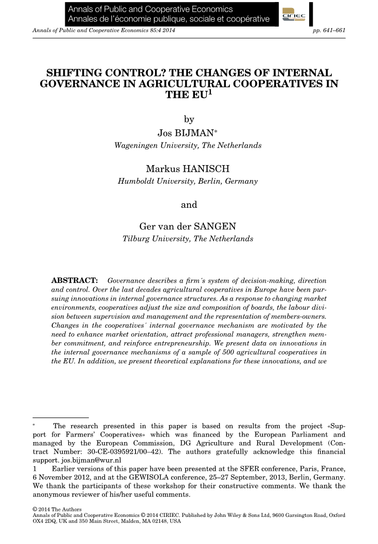 为应对立法改革,市场集中和国际化等新的战略挑战,欧洲农业合作社正在将更多的决策权力从成员转移到管理人员。与此同时,合作社正在专业化管理监督。这两个发展导致农业合作社内部治理的各种创新机制和过程的出现。