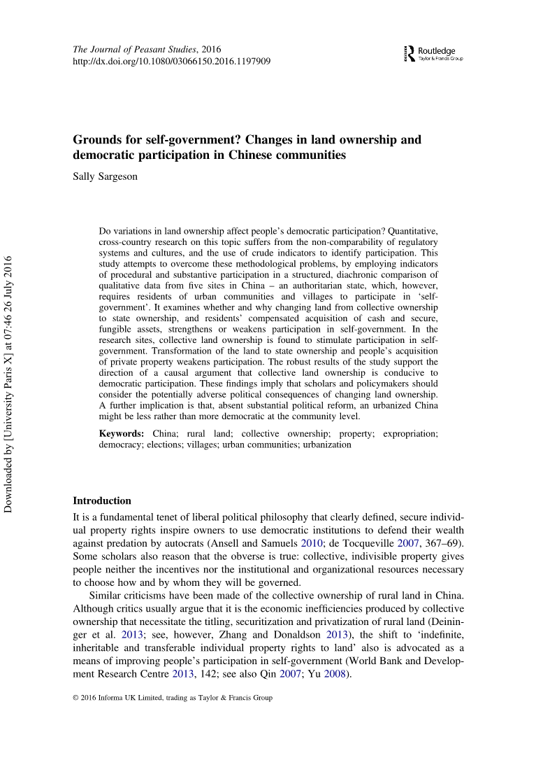 在中国,土地所有权发生变化时,人们对自治的参与是否发生了变化?我们缺乏经验证据来回答这个问题。到目前为止,所有权形式和民主之间的关系主要是通过粗略的民主程序指标和在一个时间点收集的大n数据集来检验的,这些方法是测量相关性的理想方法,但不能确定因果机制和途径(Gerring 2009103)。