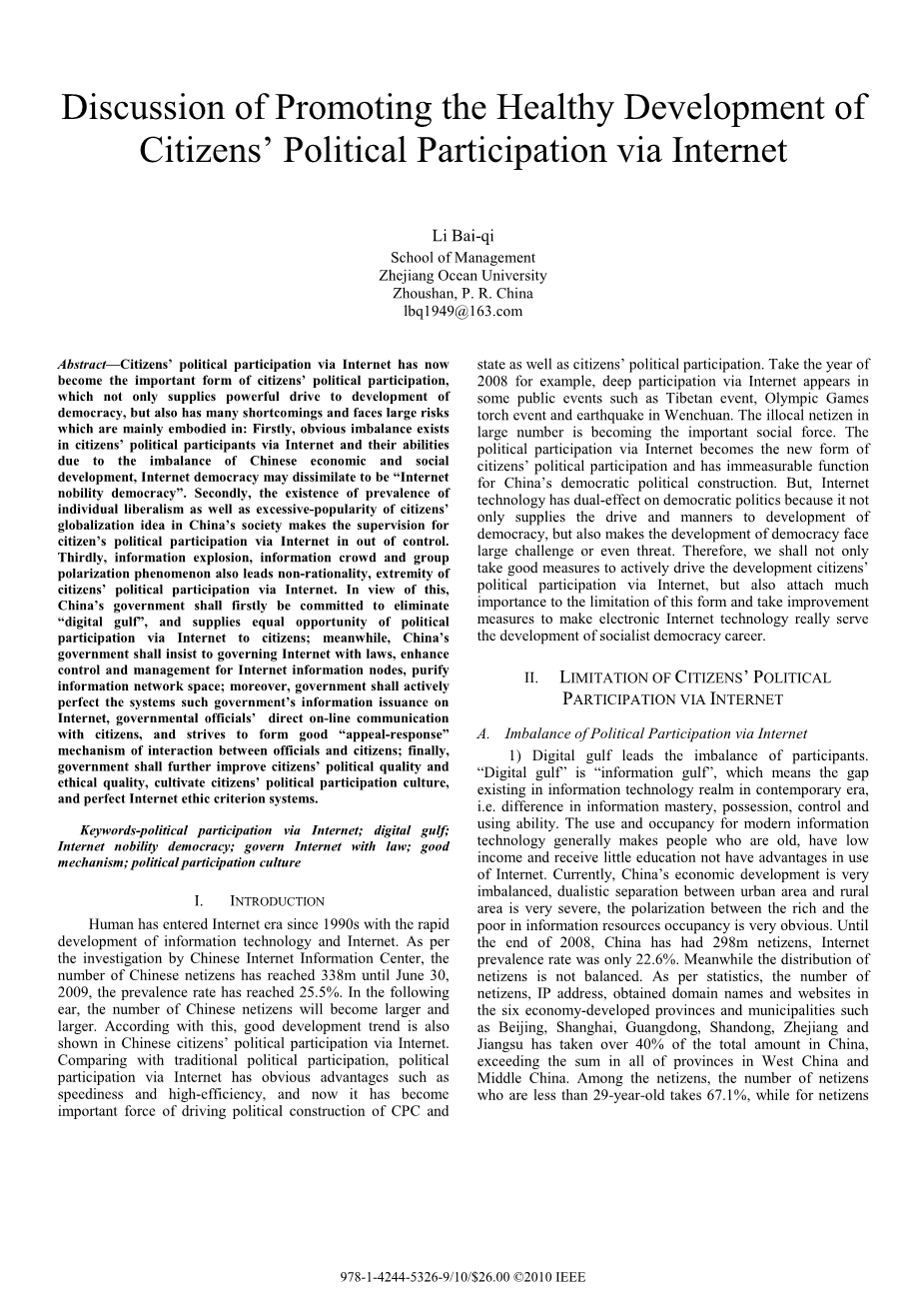 20世纪90年代以来,随着信息技术和互联网的飞速发展,人类进入了互联网时代。据中国互联网信息中心调查,截至2009年6月30日,中国网民人数已达3.38亿,普及率已达25.5%。接下来,中国网民的数量将会越来越多。由此可见,中国公民通过互联网参与政治也呈现出良好的发展趋势。与传统政治参与相比,网络政治参与具有速度快、效率高等明显优势,现已成为推动党和国家政治建设以及公民政治参与的重要力量。以2008年为例,在西藏事件、奥运火炬传递事件、汶川地震等公共事件中,都出现了互联网的深度参与。大量的非本地网民正在成为重要的社会力量。网络政治参与成为公民政治参与的新形式,对我国的民主政治建设具有不可估量的作用。但是,互联网技术对民主政治具有双重影响,它不仅为民主的发展提供动力和方式,而且使民主的发展面临巨大的挑战甚至威胁。因此,我们不仅要采取积极措施,积极推动公民通过互联网参与政治的发展,而且要重视这种形式的局限性,采取改进措施,使电子互联网技术真正为社会主义民主事业的发展服务。