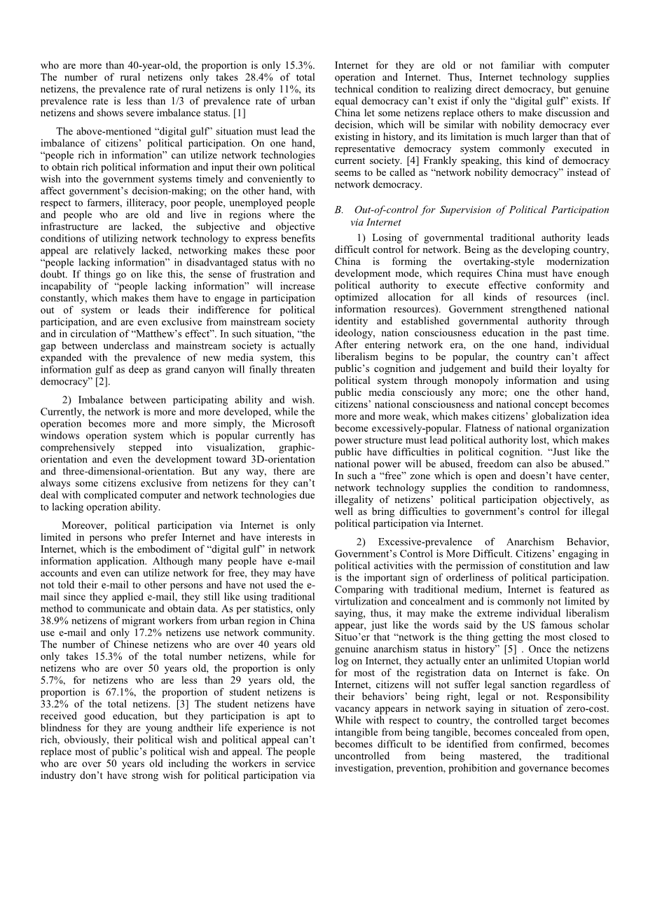 目前,网络越来越发达,操作越来越简单,目前流行的Microsoft windows操作系统已经全面进入可视化、图形化,甚至向3d、三维方向发展。但无论如何,总有一些公民由于缺乏操作能力,无法处理复杂的计算机和网络技术,被网民排斥在外。此外,通过互联网参与政治的人仅限于喜欢互联网、对互联网感兴趣的人,这是网络信息应用中的“数字鸿沟”的体现。虽然很多人都有电子邮件账户,甚至可以免费使用网络,但他们可能没有把自己的电子邮件告诉其他人,也可能自从使用电子邮件后就没有使用过,但他们仍然喜欢使用传统的方法来沟通和获取数据。据统计,在中国城市外来务工人员中,只有38.9%的网民使用电子邮件,17.2%的网民使用网络社区。中国网民的数量超过40岁的时候只需要网民总数的15.3%,而对于网民那些超过50岁的比例仅为5.7%,对于不到29岁的网民来说,这一比例是67.1%,学生网民的比例是网民总数的33.2%。[3] 学生网民虽然接受了良好的教育,但由于年龄小、生活阅历不丰富,参与过程中容易出现盲目性,显然,他们的政治意愿和政治诉求并不能替代大部分公众的政治意愿和诉求。包括服务业从业人员在内的50岁以上人群,由于年龄较大或不熟悉计算机操作和互联网,对互联网政治参与意愿不强。因此,互联网技术为实现直接民主提供了技术条件,但只有“数字鸿沟”的存在,才能实现真正的平等民主。如果中国让一些网民代替其他人进行讨论和决策,这将与历史上曾经存在的贵族民主类似,其局限性远远大于当今社会普遍实行的代议制民主。[4]坦率地说,这种民主似乎被称为“网络贵族民主”,而不是网络民主。