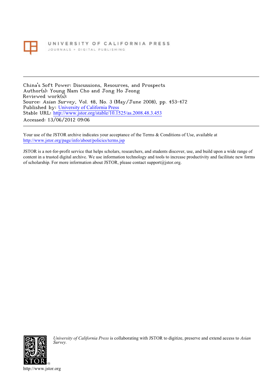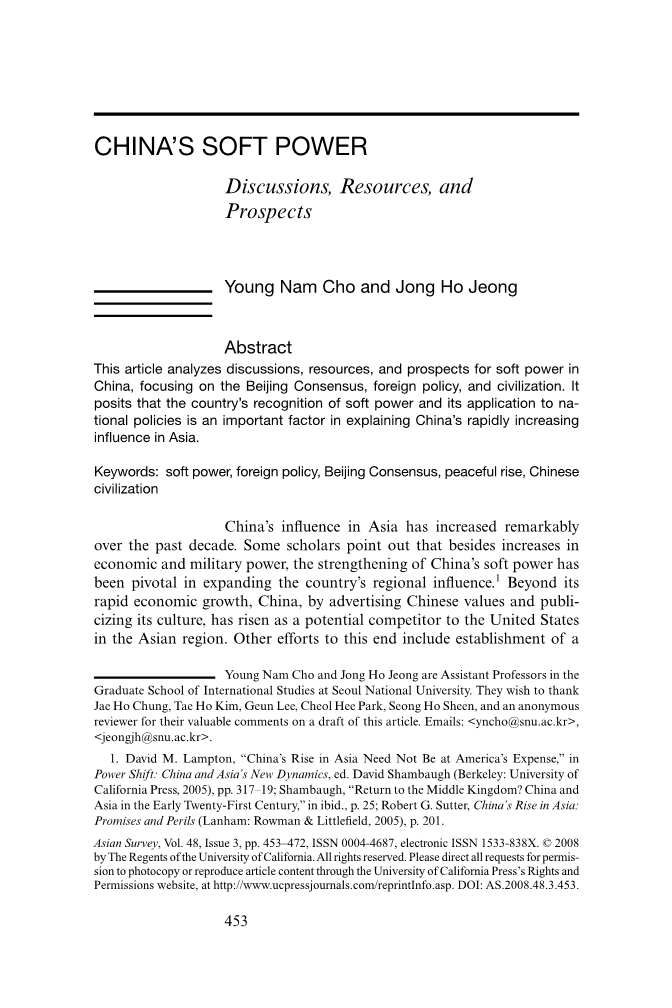 本文分析了中国软实力的讨论、资源和前景,注重北京共识、外交政策、文明建设。它假设国家对软实力的认可及其在国家中的应用,政策是解释中国经济快速增长并影响亚洲的一个重要因素。
