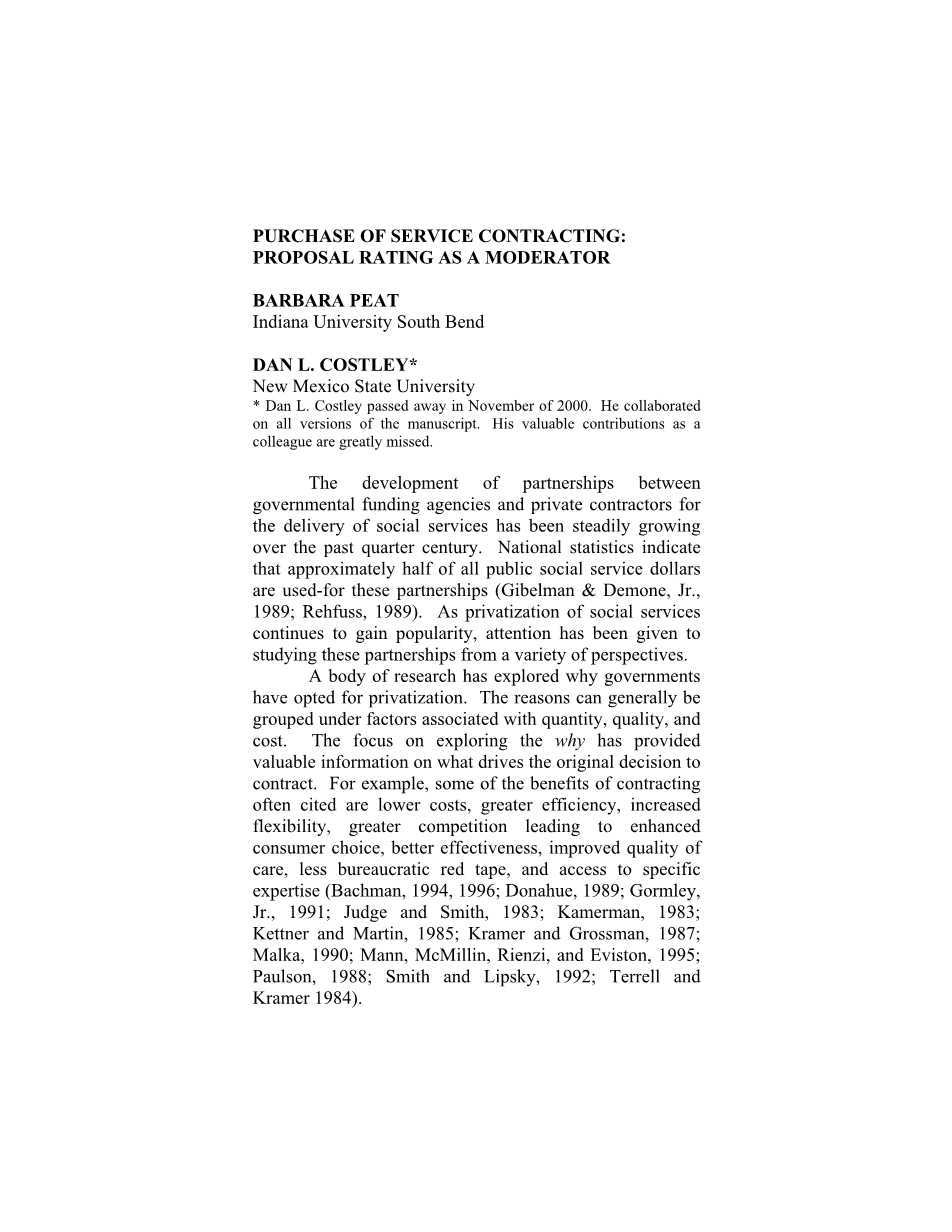 Terrell和Kramer(1984)使用了旧金山湾区一些社会服务机构的首席执行官的调查和采访。 他们通过检查过程的四个基本步骤来探讨合同管理。 在查看提案评级步骤时,他们发现“三分之二的代理商和百分之二十三的城市购买服务都有正式的评级提案和选择提供商的程序”(第34页)。 他们还发现,资金竞争越多,流程就越正规。他们继续指出“无论选择程序多么公平和竞争,它们很少完全是非政治性的”(第34页)。