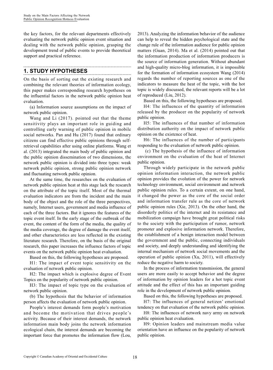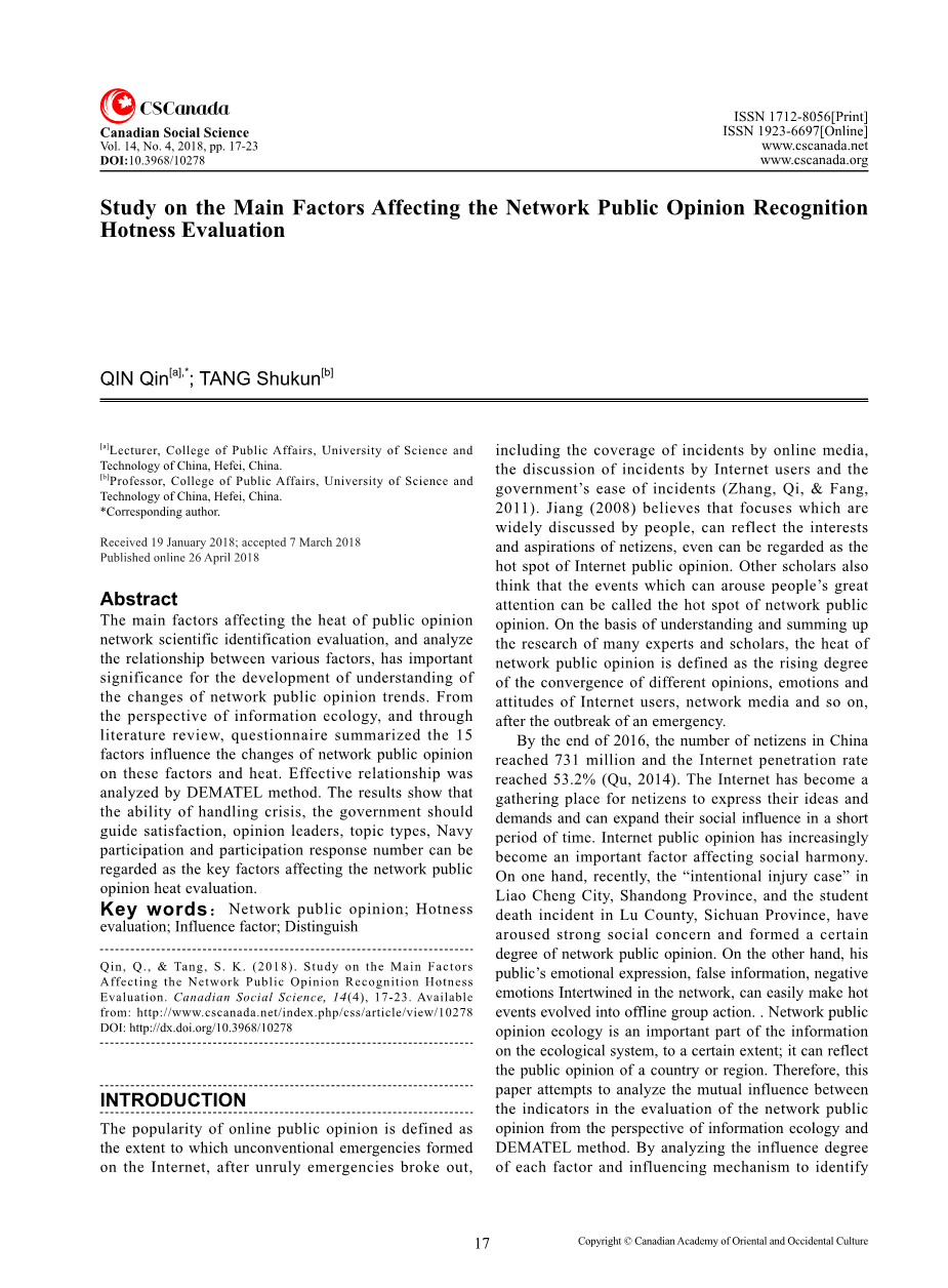 Qin,Q.,&Tang,SK(2018)。 影响网络舆论认知度热评价的主要因素研究。 加拿大社会科学,14(4),17-23。 适用于: www.cscanada.net http:/ / / / / /的index.php/102查看CSS的文章 DOI: dx.doi.org http:/ / / / 10.3968 102