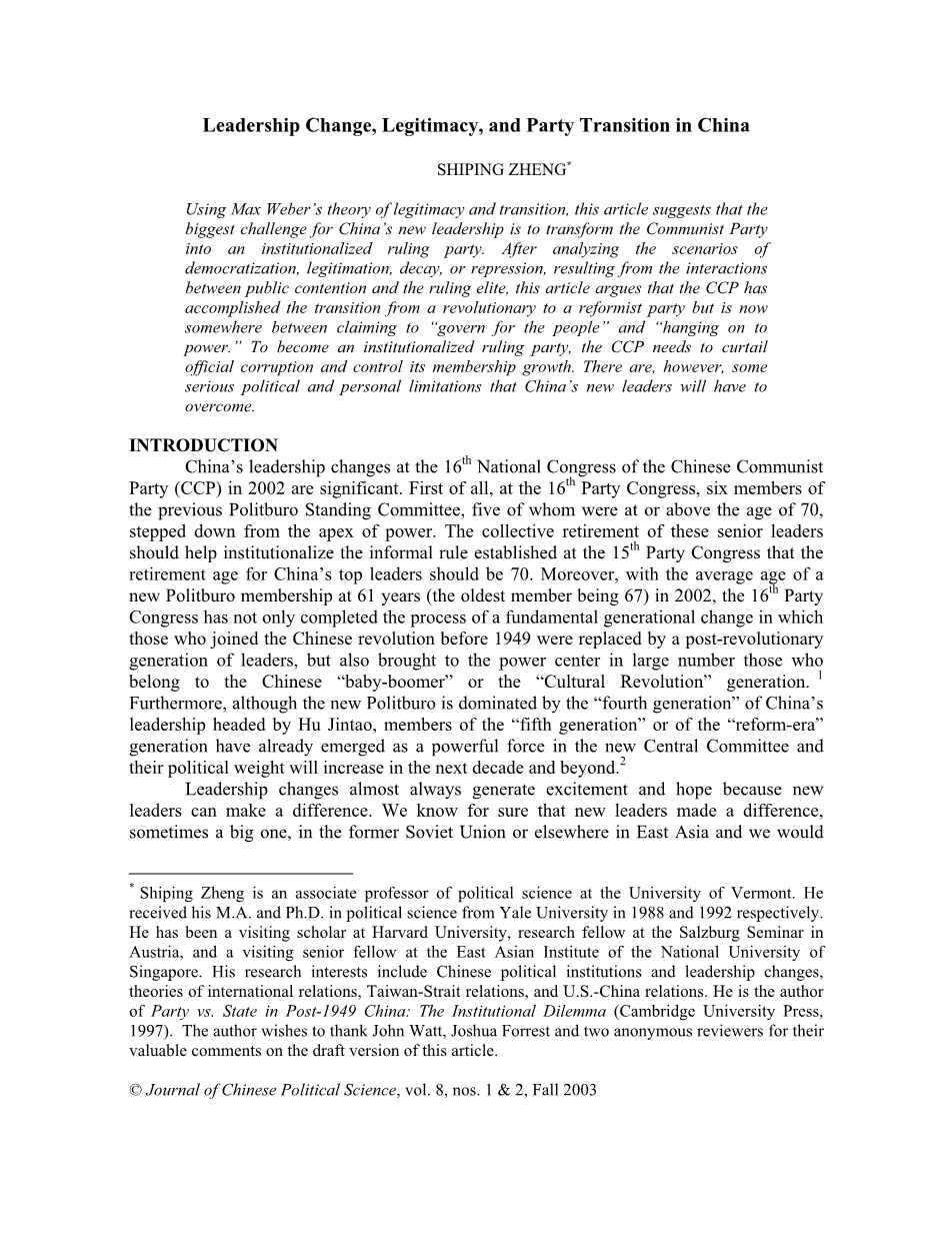 本文运用韦伯的合法性和过渡性理论,提出中国新领导层面临的最大挑战是把共产党转变为制度化的执政党。在分析了由公众争论与统治精英之间的相互作用所导致的民主化、合法化、衰败或压制的情景之后,本文认为中国共产党已经完成了从革命政党向改革派政党的过渡,但现在处于“为人民执政”和“坚持执政” 之间。为了成为一个制度化的执政党,中国共产党需要遏制官员腐败,控制党员数量的增长。然而,中国新领导人在政治和个人方面都存在一些严重的局限性需要去克服。