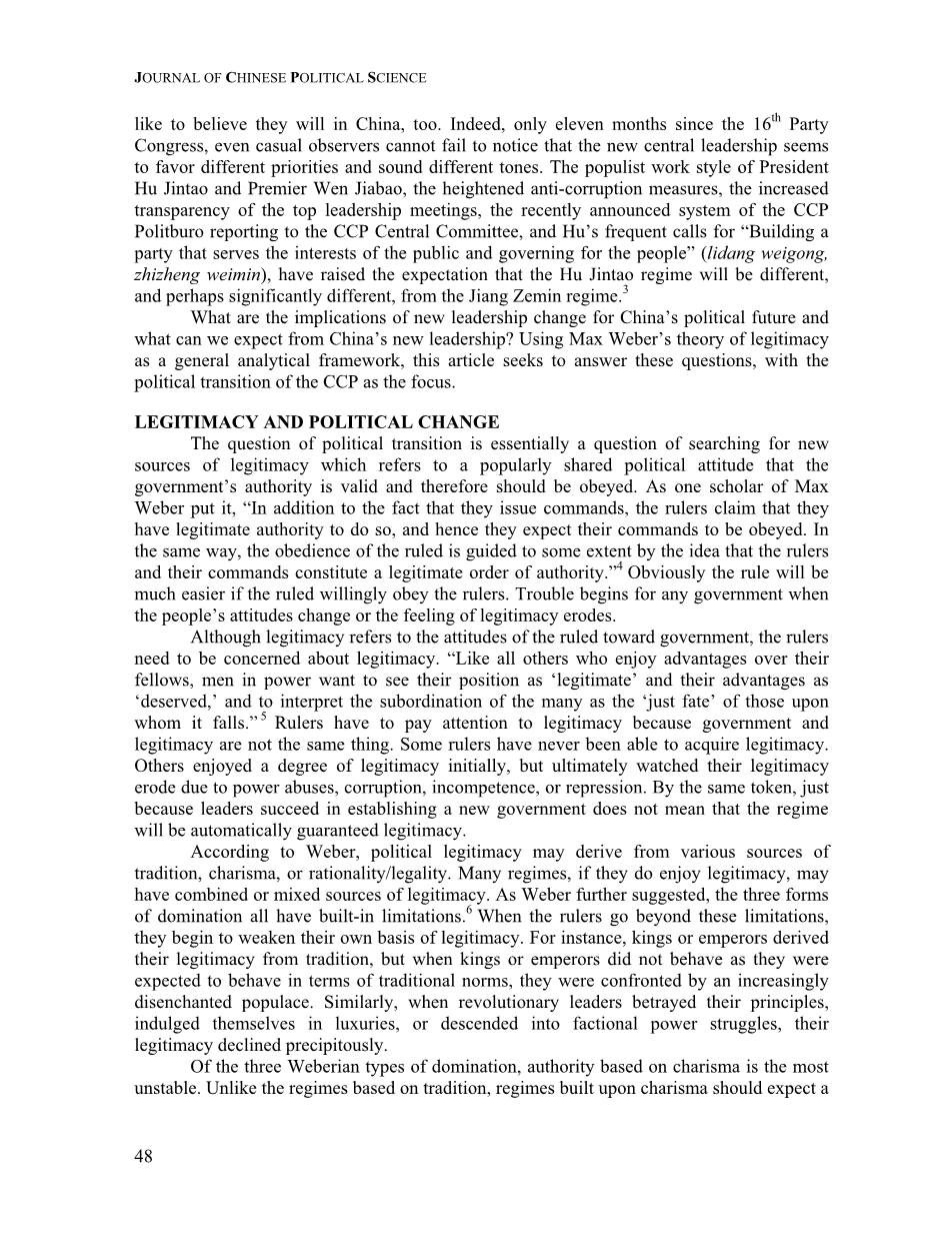 新一届领导人的更迭对中国的政治未来意味着什么,我们对中国新一届领导人的期望是什么?本文以韦伯的合法性理论为一般分析框架,以中共的政治转型为重点,试图回答这些问题。