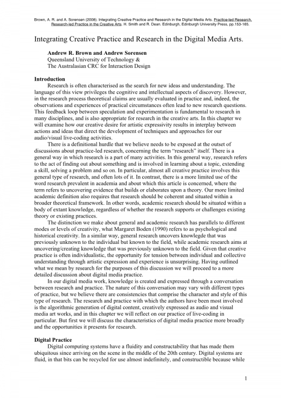 在我们的数字媒体工作中,知识是通过研究和实践之间的对话来创造和表达的。这种对话的性质可能会因不同的实践类型而有所不同,但我们相信,这类研究的特点和风格是一致的。作者参与最多的研究和实践是数字内容的算法生成,创造性地表达为音频和视觉媒体艺术作品,在这一章中,我们将特别反思我们的实时编码实践。但首先,我们将更广泛地讨论数字媒体实践的特点及其为研究提供的机遇。