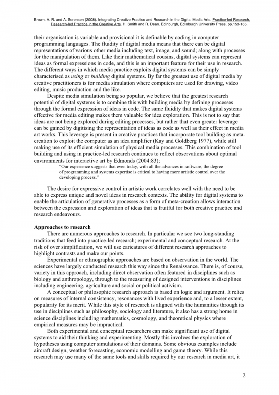 在我们的数字媒体调查中,判断成功的审美标准与所有审美标准一样,可在既定文化的范围内进行协商。项目包括一系列小规模测试的迭代,直到有可能的进行更广泛的探索。通常,这些早期迭代推动小型软件库的开发,这些软件库在处理大型工作时被使用。这样的迭代是相当多变的,对于以实践为主导的研究人员来说,一项技能就是去学习判断调查方法是否有用。一个项目通常涉及多个广泛的探索。这种迭代层次结构一直持续到成功的变得清晰,其中失败似乎是不可避免的,或者时间会耗尽。在这个过程的最后,有许多用来讨论和传播的材料,包括可用于未来项目的代码库,小规模和大规模测试的输出以及完成的创造性工作。这些数据为进一步工作或验证提供了丰富的资源。从这些数据得出的一般性结果取决于许多因素。
