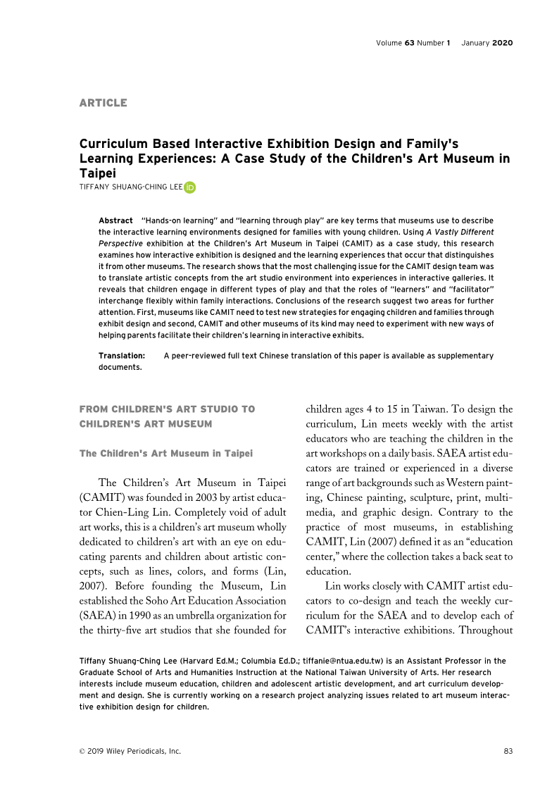 李霜青(哈佛大学,哥伦比亚大学; tiffanie@ntua.edu.tw)是国立台湾艺术大学艺术与人文教育研究生院的助理教授。她的研究兴趣包括博物馆教育,儿童和青少年的艺术发展以及艺术课程的开发和设计。她目前正在进行一项研究项目,分析与儿童博物馆互动展览设计有关的问题。