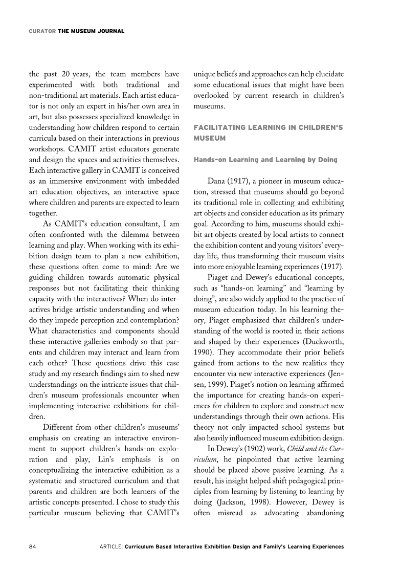 与其他儿童博物馆强调创造互动环境以支持儿童动手探索和玩耍的重点不同,林女士的重点是将互动展览概念化为系统和结构化的课程,父母和孩子都是儿童的学习者。提出的艺术观念。我选择去研究这个特殊的博物馆,认为CAMIT独特的信念和方法可以帮助阐明一些儿童博物馆目前的研究可能忽视的教育问题。