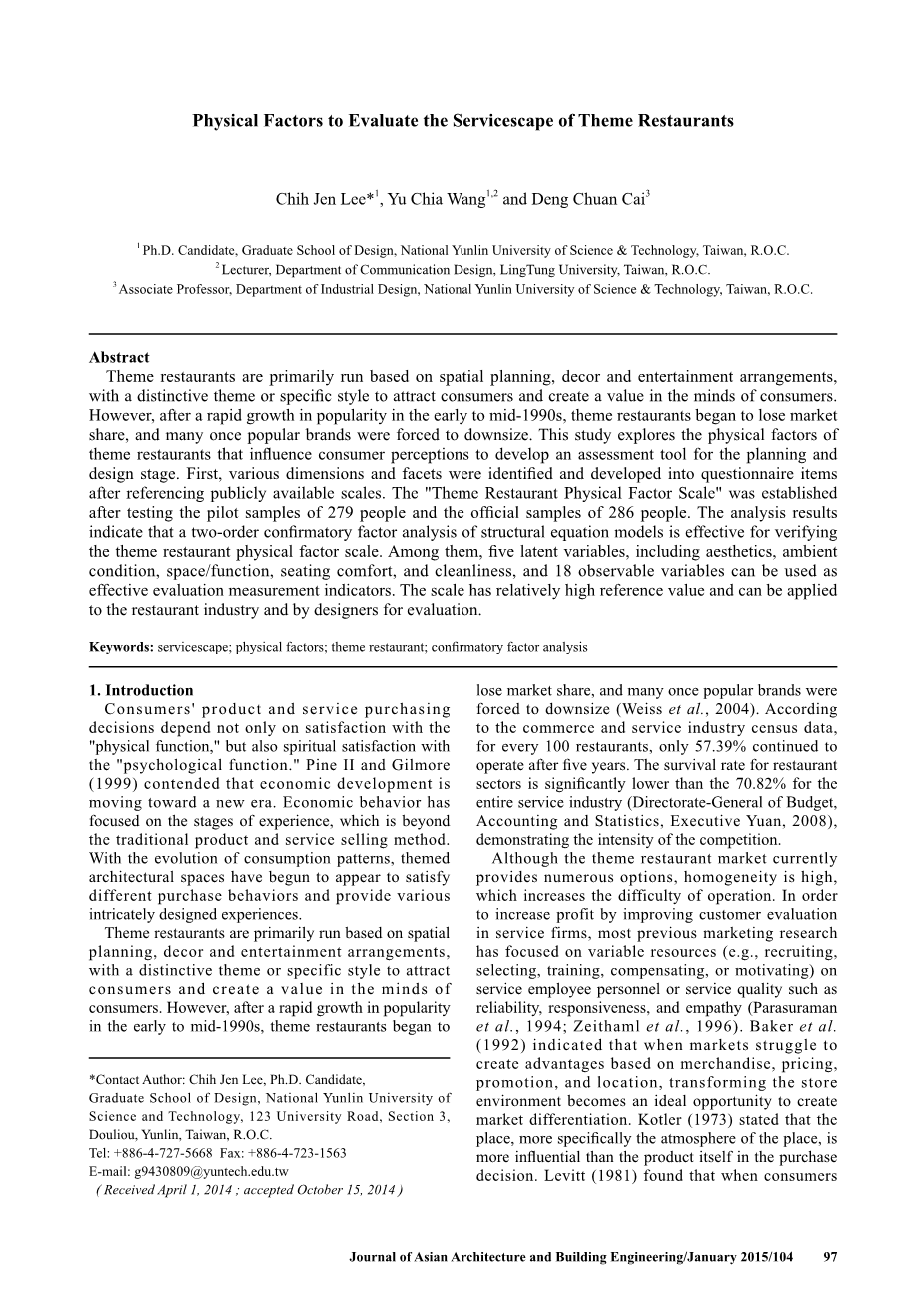当环境空气用于商业用途时,规划方向和详细设计对于预测消费至关重要。但在主题餐厅的规划设计中,设计师的设计和装饰必须遵循传统的设计标准或附加于个人的设计风格,较少考虑目标消费者的偏好。恩格尔等人。(1968)指出,要理解消费者行为,必须检查个人和情境因素。Kim和Moon(2009)还指出,主题餐厅的物理环境属性可能在改善顾客的感知和行为方面发挥重要作用。因此,要提升专业服务类别,空间设计的研究必须包括塑造消费者认知的物理因素。本研究编制服务景观相关研究,筛选各种物理因子,建立“主题餐厅物理因子量表”,并采用二阶验证性因子分析法对量表的稳定性和拟合优度进行分析,验证该模型是否适用于“主题餐厅物理因素量表”的评价,并为设计人员和实际应用提供反馈。