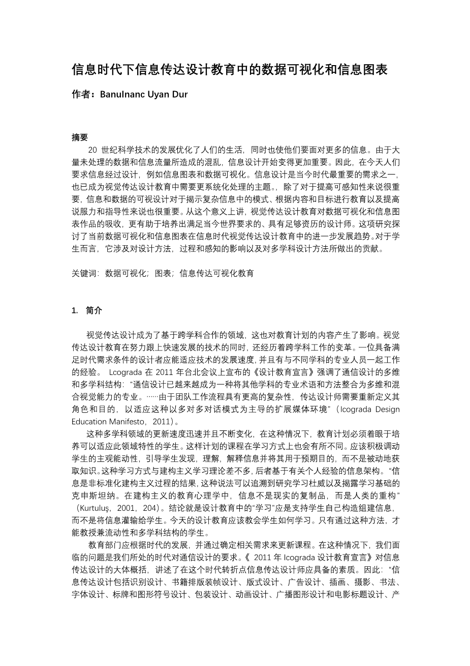 信息时代下信息传达设计教育中的数据可视化和信息图表外文翻译资料 2022-08-09 16:08:44 英语原文共 12 页,剩余内容已隐藏,支付完成后下载完整资料 英语译文共 13 页,剩余内容已隐藏,支付完成后下载完整资料 资料编号:[238957],资料为PDF文档或Word文档,PDF文档可免费转换为Word 原文和译文剩余内容已隐藏,您需要先支付 30元 才能查看原文和译文全部内容!立即支付 发小红书推广免费获取该资料资格。点击链接进入获取推广文案即可: Ai一键组稿 | 降AI率 | 降重复率 | 论文一键排版 PREVIOUS NEXT 您可能感兴趣的文章 烟气分析仪外文翻译资料 英国的数据新闻:形式和内容的初步分析外文翻译资料 基于情感体验的中国电子游戏设计创新外文翻译资料 澳大利亚在医疗.上使用的设置口译员和法医体检:医药和语 言学之间的关系外文翻译资料 汉代漆器设计美学外文翻译资料 医学教育,PDAS和智能手机:欢迎来到21世纪外文翻译资料 婴儿车在交通工具汽车上的动态表现和安全性分析外文翻译资料 通过融合Kano,QFD和FAST方法设计的多功能婴儿车外文翻译资料 儿童手推车的艺术状态: 儿童手推车中的设计概述和人体工程学的创新外文翻译资料 中国溺水救援人员的死亡率,2013年:225起新闻报道的救援事件回顾外文翻译资料