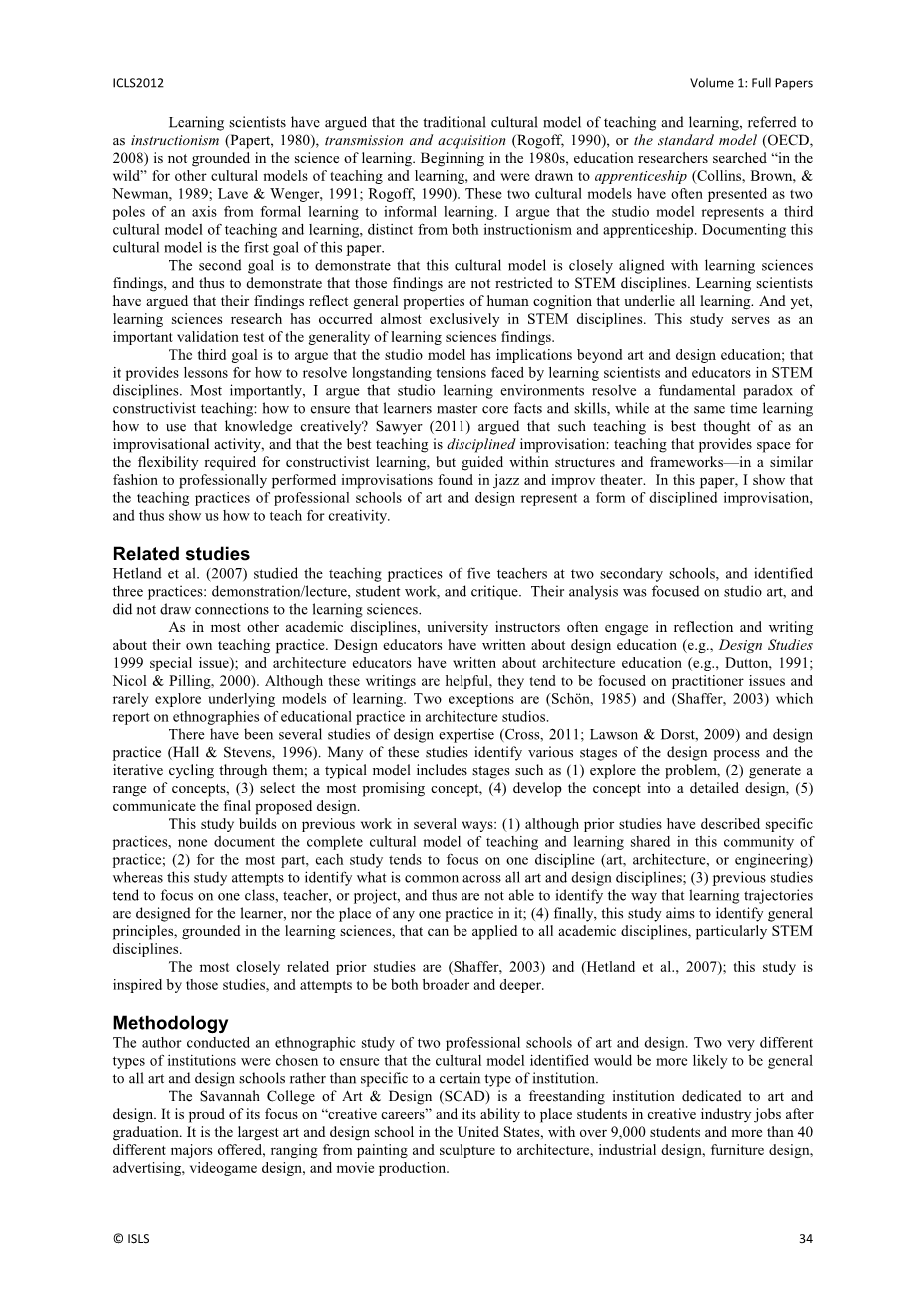 第三个目标是争辩说工作室模型的意义不仅仅限于艺术和设计教育。它为如何解决STEM学科的学习科学家和教育工作者所面临的长期紧张关系提供了经验教训。最重要的是,我认为工作室学习环境解决了建构主义教学的一个基本悖论:如何确保学习者掌握核心事实和技能,同时学习如何创造性地使用知识?索耶(Sawyer(2011))认为,最好将这种教学视为即兴创作活动,而最好的教学是有规律的即兴创作:为建构主义学习所需的灵活性提供空间的教学,但应在结构和框架内进行指导,其方式类似于在爵士和即兴剧院中发现的专业演奏即兴演奏。在本文中,我证明了艺术与设计专业学校的教学实践是一种即兴即兴的形式,从而向我们展示了如何为创造力而教。