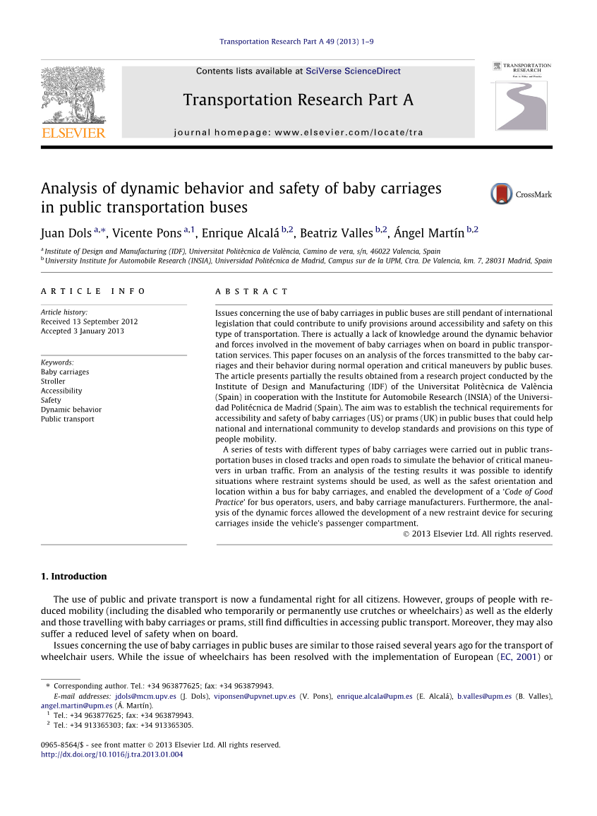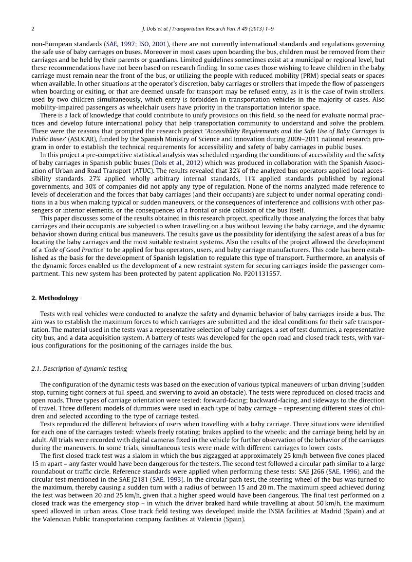 在这个项目中,计划在西班牙的公共汽车上进行婴儿车的无障碍和安全性的统计分析(Dols et al .2012)。这是与西班牙城市和铁路运输协会(ATUC)合作完成的。有32%数据分析表明,公交车运营商采用的当地的可达性标准,27%的则表明随意的采用了内部标准,11%的数据表明采用了地方政府所发布的标准,而30%的公司没有采用任何监管制度。没有任何规范的分析提及到了减速的水平以及婴儿车(包括使用者)受力问题,例如婴儿车在遭受公交车进行突然起步、或在汽车内部与其他乘客或其他物体产生碰撞、或公共汽车本身正面或侧面遭受撞击后产生的影响都未提及。