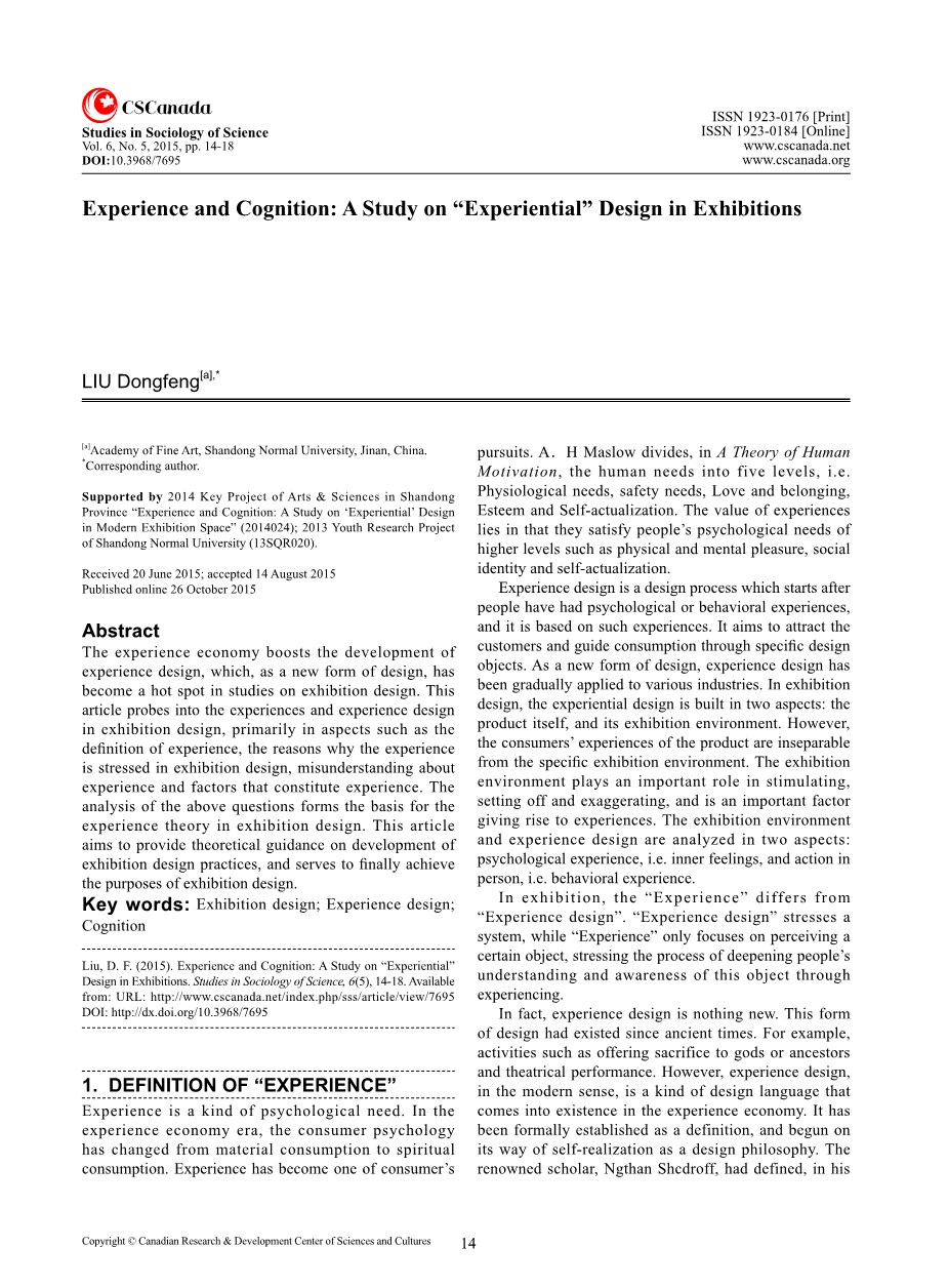 “2014年度山东省文科重点项目”经验与认识:现代展览空间“体验式”设计研究(2014024); 2013山东师范大学青年研究项目(13SQR020)。