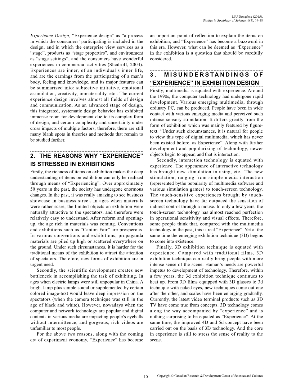 Liu,DF(2015)。 体验与认知:展览中“体验”设计研究。 科学社会学研究,6(5),14-18。 可用来源:网址:http://www.cscanada.net/index.php/sss/article/view/7695 DOI:http://dx.doi.org/10.3968/7695