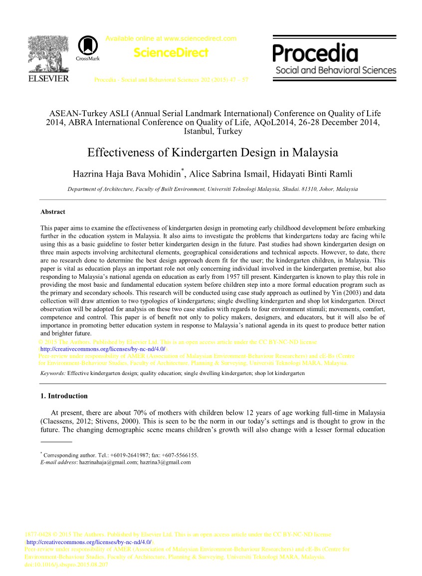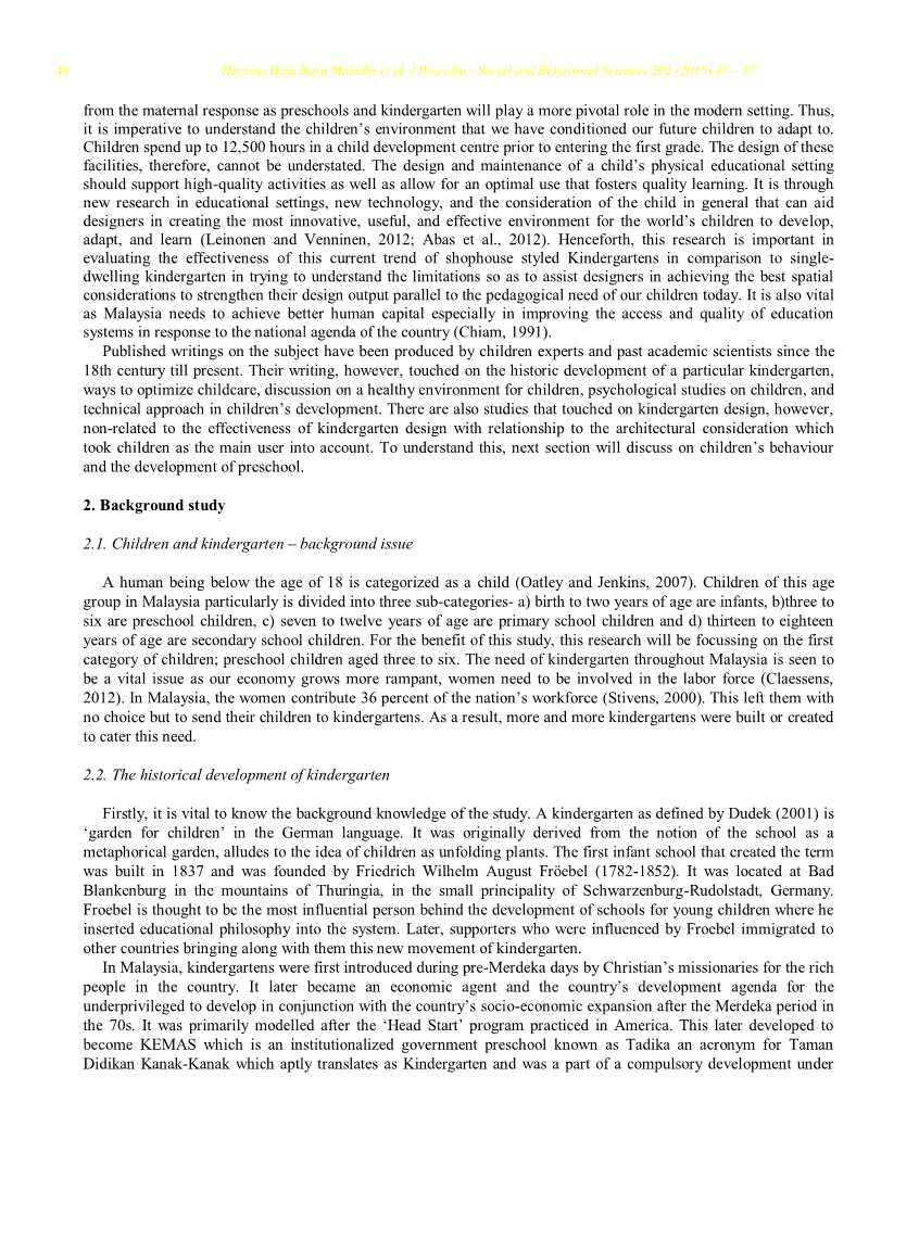 从母亲的反应来看,幼儿园和幼儿园将在现代环境中扮演更为关键的角色。因此,我们必须了解孩子的环境,我们已经调节了我们未来的孩子适应。儿童在进入初级阶段之前在儿童发展中心花费12500小时。因此,这些设施的设计是不可低估的。儿童体育教育的设计和维护应该支持高质量的活动,并允许促进质量学习的最佳使用。通过对教育背景、新技术和对儿童的总体研究,可以帮助设计师为世界儿童创造最具创新性、实用性和有效性的环境,使之发展、适应和学习(Leinonen和VeNeNEN,2012;Abas et a)。L,2012)。从此以后,本研究对于评估目前住宅小区式幼儿园与单户幼儿园相比的有效性有重要的意义,以便帮助设计者在空间上考虑最佳的设计。他们的设计与今天的孩子们的教育需求相平行。这也是至关重要的,因为马来西亚需要实现更好的人力资本,特别是在提高教育系统的准入和质量,以响应国家的国家议程(CHIAM,1991)。