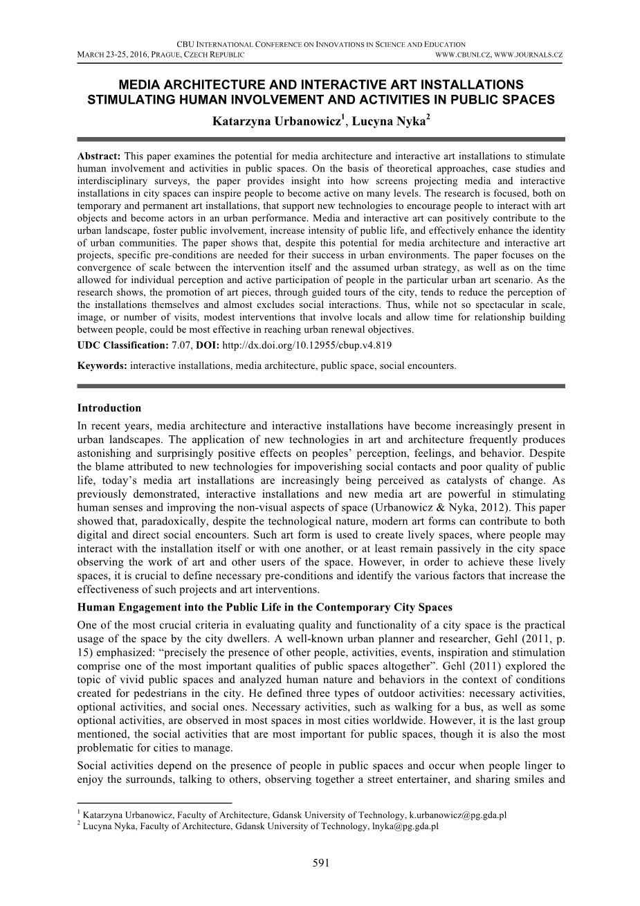 近年来,媒体建筑和互动装置在城市景观中日益呈现。新技术在艺术和建筑上的应用经常会对人们的感知、情感和行为产生惊人的、令人惊讶的积极影响。尽管新技术导致了社会联系的枯竭和公共生活质量的低下,但今天的媒体艺术装置越来越被视为变革的催化剂。如前所述,互动装置和新媒体艺术在刺激人的感官和改善空间的非视觉方面(Urbanowicz amp; Nyka, 2012)具有强大的功能。这篇论文表明,尽管具有技术性质,现代艺术形式仍然可以促进数字化和直接的社会交往。这种艺术形式被用来创造生动的空间,人们可以与装置本身或彼此互动,或者至少是被动地在城市空间里观察艺术和空间的其他使用者的工作。然而,为了实现这些生动的空间,必须确定必要的先决条件,并确定增加此类项目和艺术干预效果的各种因素。