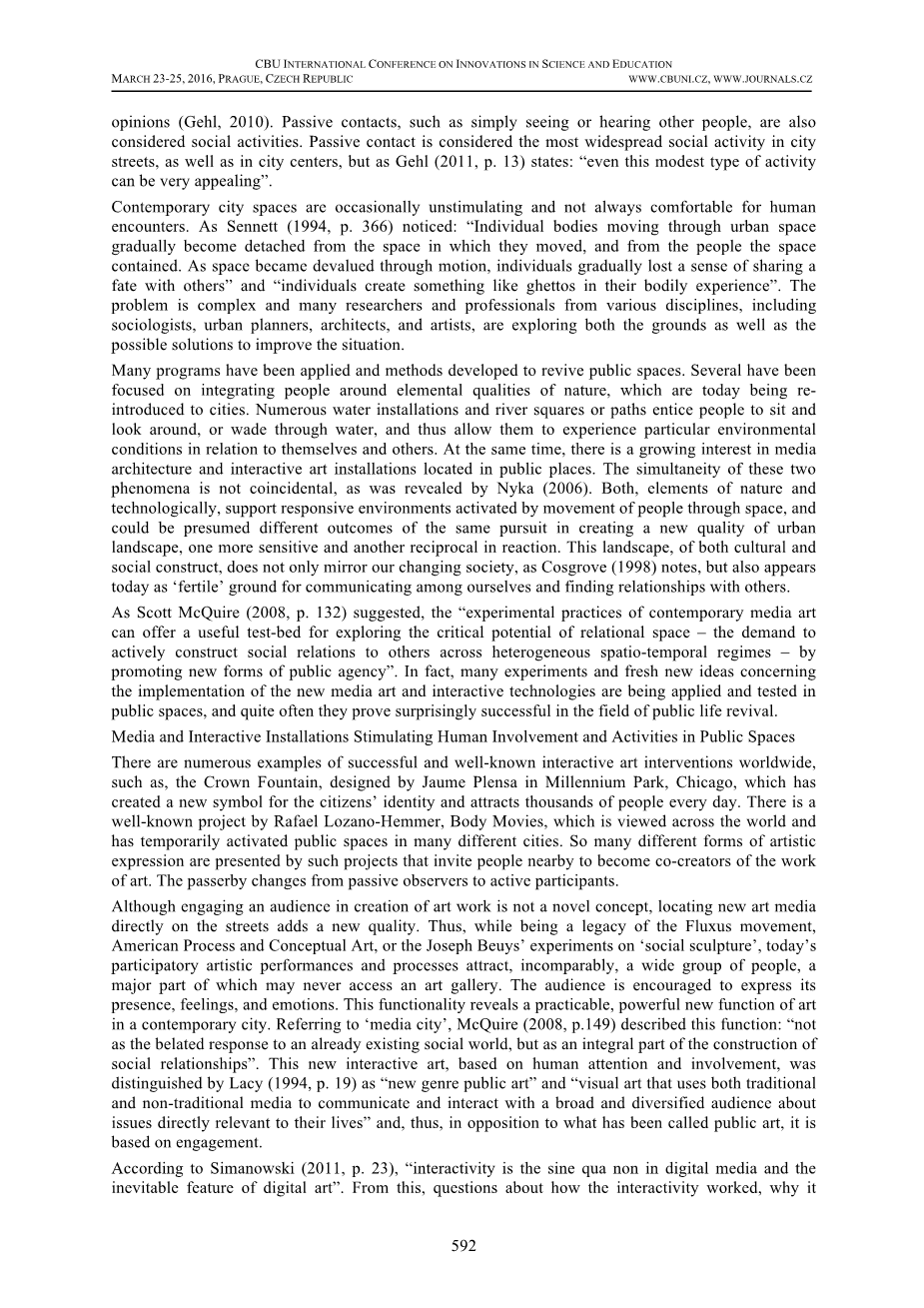 许多项目已经被应用,并开发了一些方法来恢复公共空间。有几家公司一直致力于将人们与大自然的基本性质结合起来,而这些特质如今正被重新引入城市。大量的水装置和河流的广场或道路诱使人们坐着四处张望,或涉水而过,从而让他们体验到与自己和他人有关的特殊环境条件。与此同时,人们对公共场所的媒体建筑和互动艺术装置越来越感兴趣。这两种现象的同时性并非巧合,正如Nyka(2006)所揭示的那样。这两者都是自然和技术的元素,支持人们通过空间运动激活的响应性环境,也可以假定在创造一种新的城市景观质量时,同样的追求会产生不同的结果,一种更加敏感,另一种则相反。这一文化和社会结构的景观,不仅反映了我们社会的变化,正如Cosgrove(1998)所指出的,而且今天也成为我们之间交流和寻找关系的“沃土”。