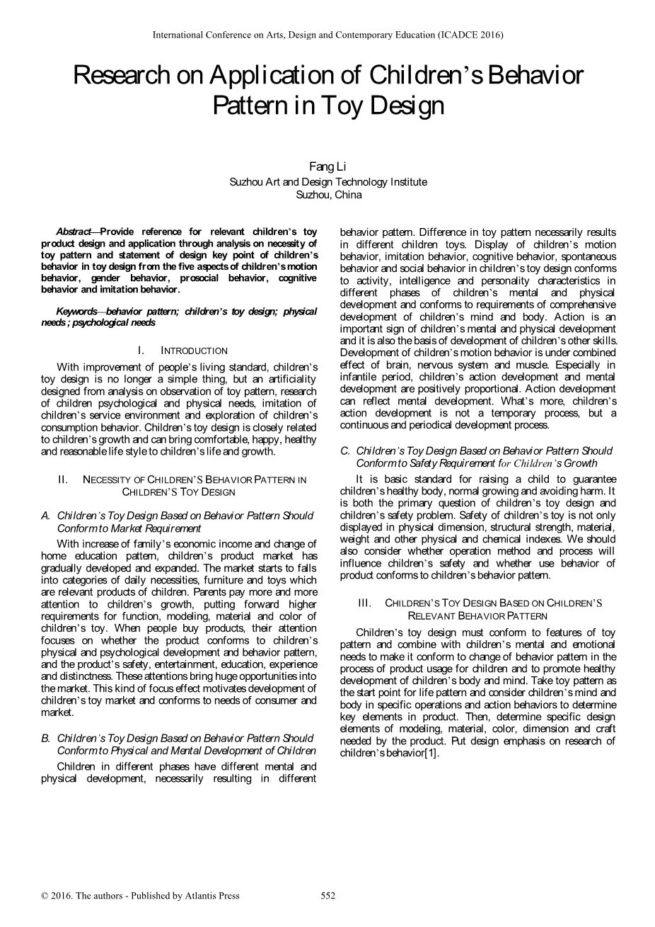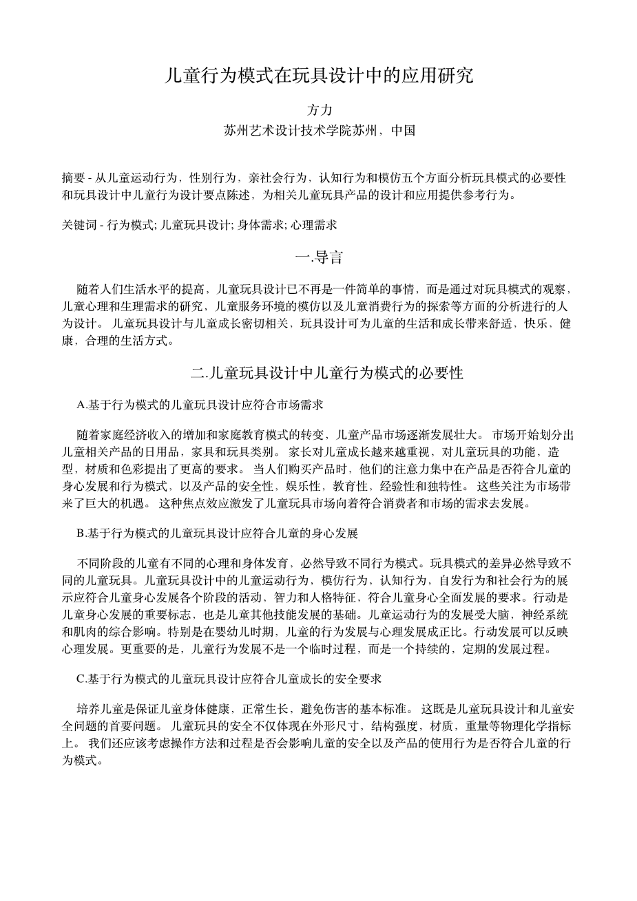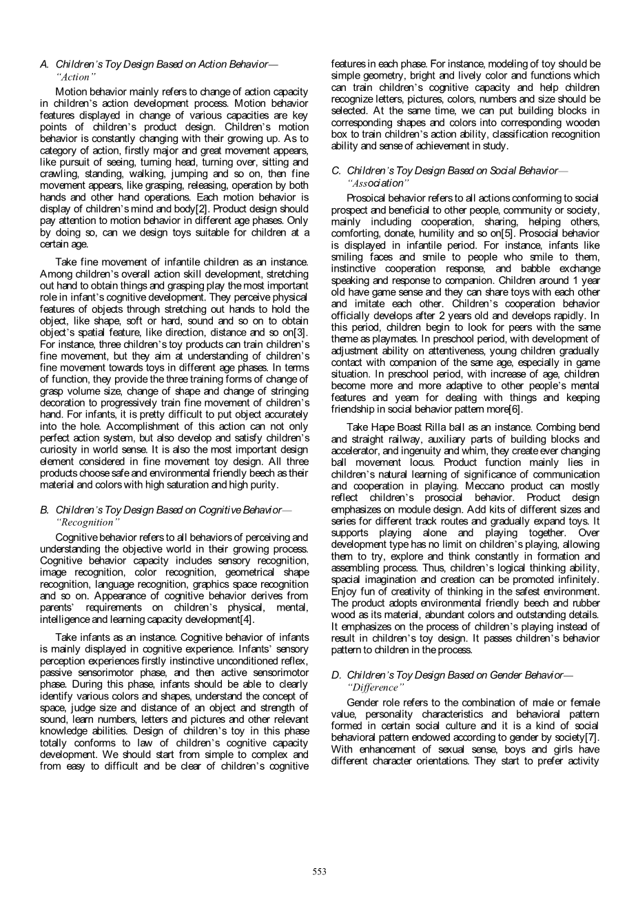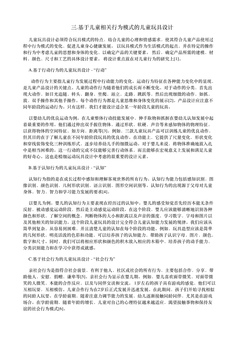 绳与木组合拼接启智玩具设计外文翻译资料 2022-03-29 22:11:35 英语原文共 3 页,剩余内容已隐藏,支付完成后下载完整资料 英语原文共 4 页,剩余内容已隐藏,支付完成后下载完整资料资料编号:[14816],资料为PDF文档或Word文档,PDF文档可免费转换为Word 原文和译文剩余内容已隐藏,您需要先支付 30元 才能查看原文和译文全部内容!立即支付 发小红书推广免费获取该资料资格。点击链接进入获取推广文案即可: Ai一键组稿 | 降AI率 | 降重复率 | 论文一键排版 PREVIOUS NEXT 您可能感兴趣的文章 烟气分析仪外文翻译资料 英国的数据新闻:形式和内容的初步分析外文翻译资料 基于情感体验的中国电子游戏设计创新外文翻译资料 澳大利亚在医疗.上使用的设置口译员和法医体检:医药和语 言学之间的关系外文翻译资料 汉代漆器设计美学外文翻译资料 医学教育,PDAS和智能手机:欢迎来到21世纪外文翻译资料 婴儿车在交通工具汽车上的动态表现和安全性分析外文翻译资料 通过融合Kano,QFD和FAST方法设计的多功能婴儿车外文翻译资料 儿童手推车的艺术状态: 儿童手推车中的设计概述和人体工程学的创新外文翻译资料 中国溺水救援人员的死亡率,2013年:225起新闻报道的救援事件回顾外文翻译资料