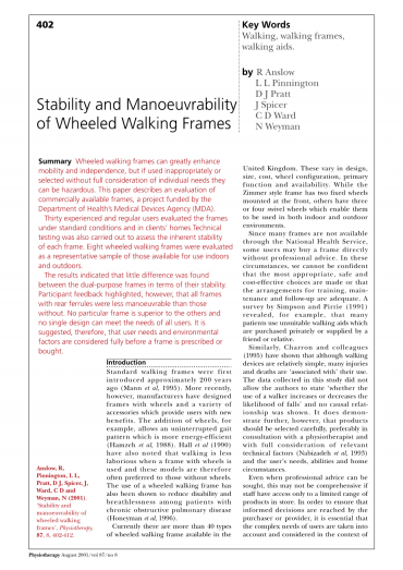 轮式行走架可以极大地增强机动性和独立性,但如果使用不当或没有充分考虑到个人需要而选择它们有危险。本文描述了由美国卫生部医疗器械局(MDA)资助的一个项目——对商业可用框架的评估。30名经验丰富的老用户在标准条件下和客户家中对这些框架进行了评估。并进行了技术测试,以评估每一帧的固有稳定性。评估了8个轮式行走架作为室内和室外使用的代表性样本。
